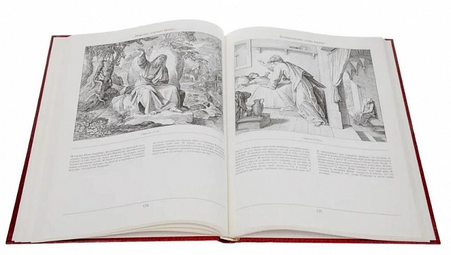 Книга содержит иллюстрации к Ветхому и Новому завету, выполненные на дереве с библейскими текстами по юбилейному изданию Синоидального перевода. Книга содержит 240 гравюр известного немецкого художника XIX века Юлиуса фон Карольсфельда на темы Священного Писания и соответствующие им библейские тексты в Синодальном переводе.