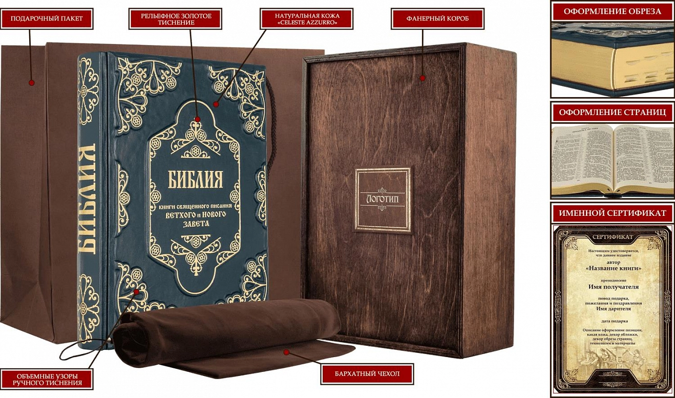 БИБЛИЯ. ВЕТХИЙ И НОВЫЙ ЗАВЕТ (CELESTE AZZURRO) АННОТАЦИЯ Издана по благословлению патриарха московского и всея Руси Алексия II. Одно из лучших изданий для изучения Священного Писания. Огромный шрифт, современная редакция синодального перевода, рисовая тонированная бумага для минимизации усталости глаз, в комплекте идут цветные карты святых мест, листы для памятных дат. ОФОРМЛЕНИЕ Составной переплет «Брадель», ручной работы, выполнен из натуральной кожи «Celeste Azzurro» производства итальянской кожевенной фабрики «Carisma». Обложка книги оформлена в авторской технике «рельефное тиснение по объемным узорам». Обрез вручную полирован и позолочен, оформлен поисковыми индексами. Сертификат. Бархатный чехол. Количество страниц - 1 256 Формат – 220х300х65 мм. Вес – 2.77 кг.