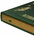 Переплет ручной работы. Натуральная переплетная кожа. Цвет зеленый травяной. Каптал из шелковых нитей. Ляссе шелковое. Обрез торшонированный золотой фольгой. Блинтовое тиснение в виде колокола на обложке, русский орнамент по корешку. Тиснение полиграфической фольгой. Украшение переплета: фольгированная плашка с изображением Георгия Победоносца.