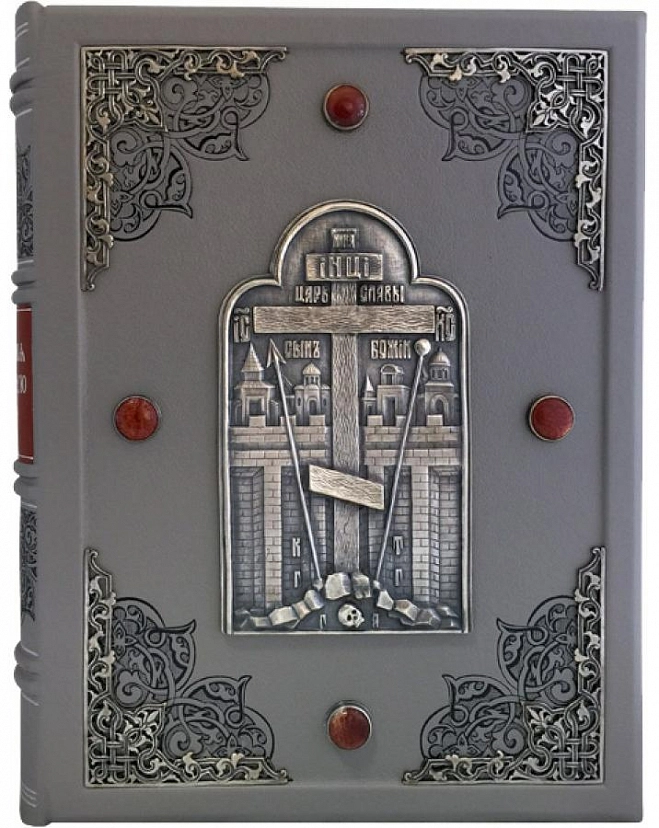 Украшение переплета: Ювелирные накладки - художественное литье, ручная работа - латунь. Серебрение, чернение. Ювелирные вставки - натуральный камень( яшма), огранка кабошон.