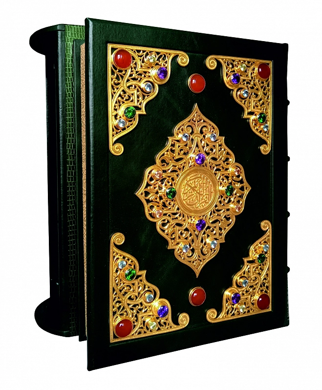 Французский цельнокожаный переплет ручной работы. Натуральная переплетная кожа. Цвет Зеленый. Форзац составной на кожаной слизуре. Дизайнерская бумага. Каптал двойной наборный, ручное плетение из шелковых нитей. Обрез торшонированный золотой фольгой. Ляссе шелковое. Украшение переплета: тиснение полиграфической фольгой. Накладные элементы-позолоченное серебро. Ювелирные вставки: цветные фианиты бриллиантовой огранки, кабашоны. Подарочный футляр. Подарок, достойный эмиров и шейхов. Драгоценное оформление. На каждой странице: изысканная арабская вязь, цветные восточные орнаменты (золото, серебро, печать 4 краски).