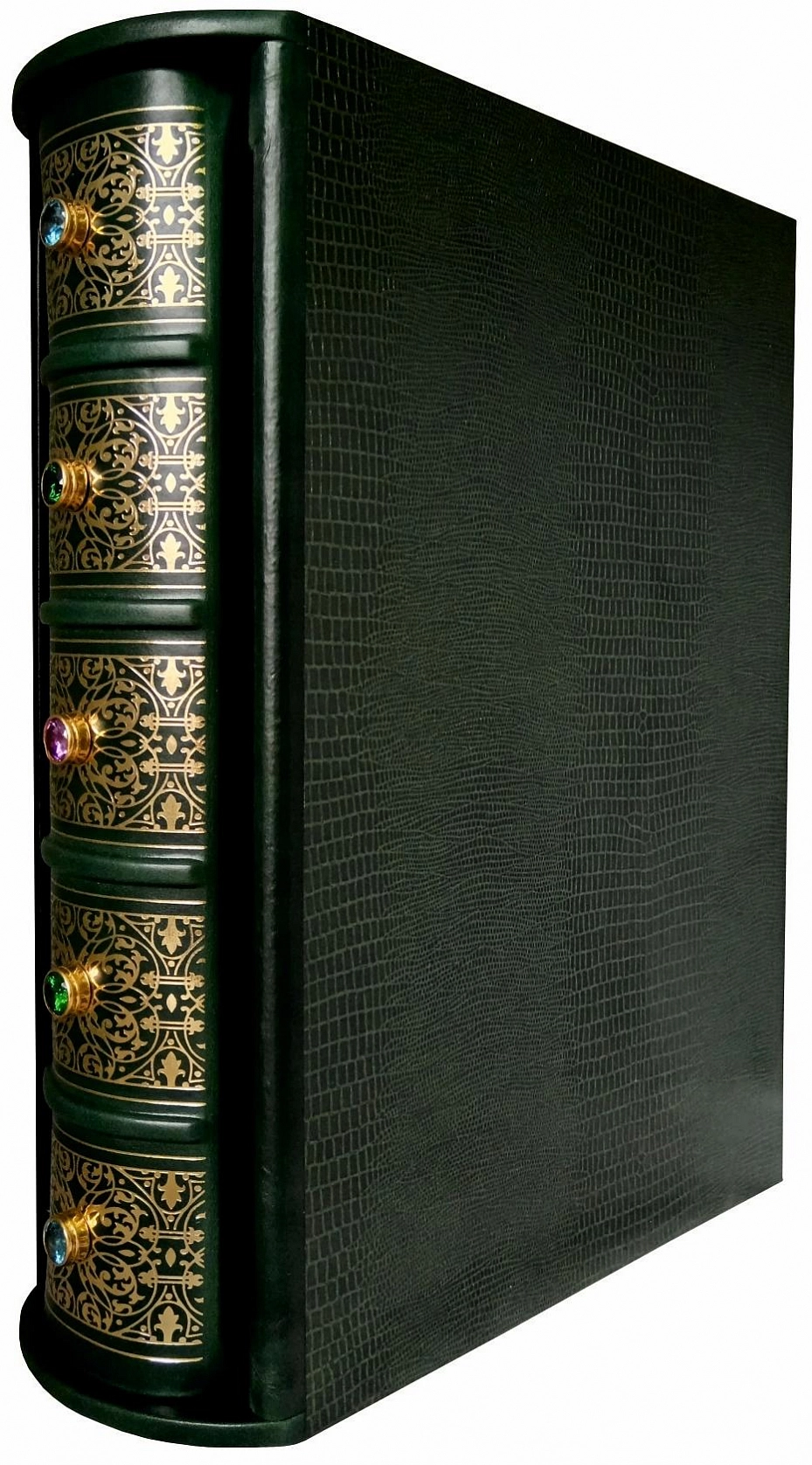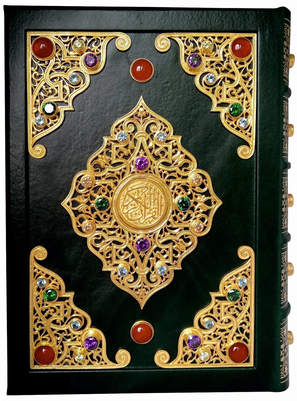 Французский цельнокожаный переплет ручной работы. Натуральная переплетная кожа. Цвет Зеленый. Форзац составной на кожаной слизуре. Дизайнерская бумага. Каптал двойной наборный, ручное плетение из шелковых нитей. Обрез торшонированный золотой фольгой. Ляссе шелковое. Украшение переплета: тиснение полиграфической фольгой. Накладные элементы-позолоченное серебро. Ювелирные вставки: цветные фианиты бриллиантовой огранки, кабашоны. Подарочный футляр. Подарок, достойный эмиров и шейхов. Драгоценное оформление. На каждой странице: изысканная арабская вязь, цветные восточные орнаменты (золото, серебро, печать 4 краски).