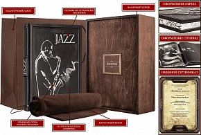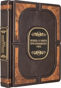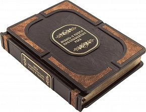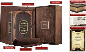 Составной переплет «Брадель», ручной работы, из комбинации натуральной кожи теленка «Latte» и кожи «Robbat Nero» производства итальянской кожевенной фабрики «Carisma». Обложка книги двухуровневая, оформлена комбинацией глубокого блинтового и рельефного золотого тиснения (с использованием золотой фольги «Luxor 240»). Обрез выполнен в уникальной технологии художественной запечатки золотой основы.