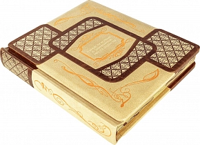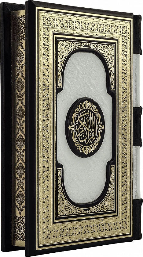 КОРАН (НА АРАБСКОМ ЯЗЫКЕ) ОФОРМЛЕНИЕ Составной переплет «Брадель», ручной работы, из комбинации натуральной кожи теленка «Latte» и кожи «Robbat Nero» производства итальянской кожевенной фабрики «Carisma». Обложка книги двухуровневая, оформлена комбинацией глубокого блинтового и рельефного золотого тиснения (с использованием золотой фольги «Luxor 240»). Обрез выполнен в уникальной технологии художественной запечатки золотой основы. Сертификат. Бархатный чехол. Количество страниц – 620 с. (офсетная бумага, цветная печать). Формат книги – 152х205х40 мм. Вес книги – 0,8 кг.