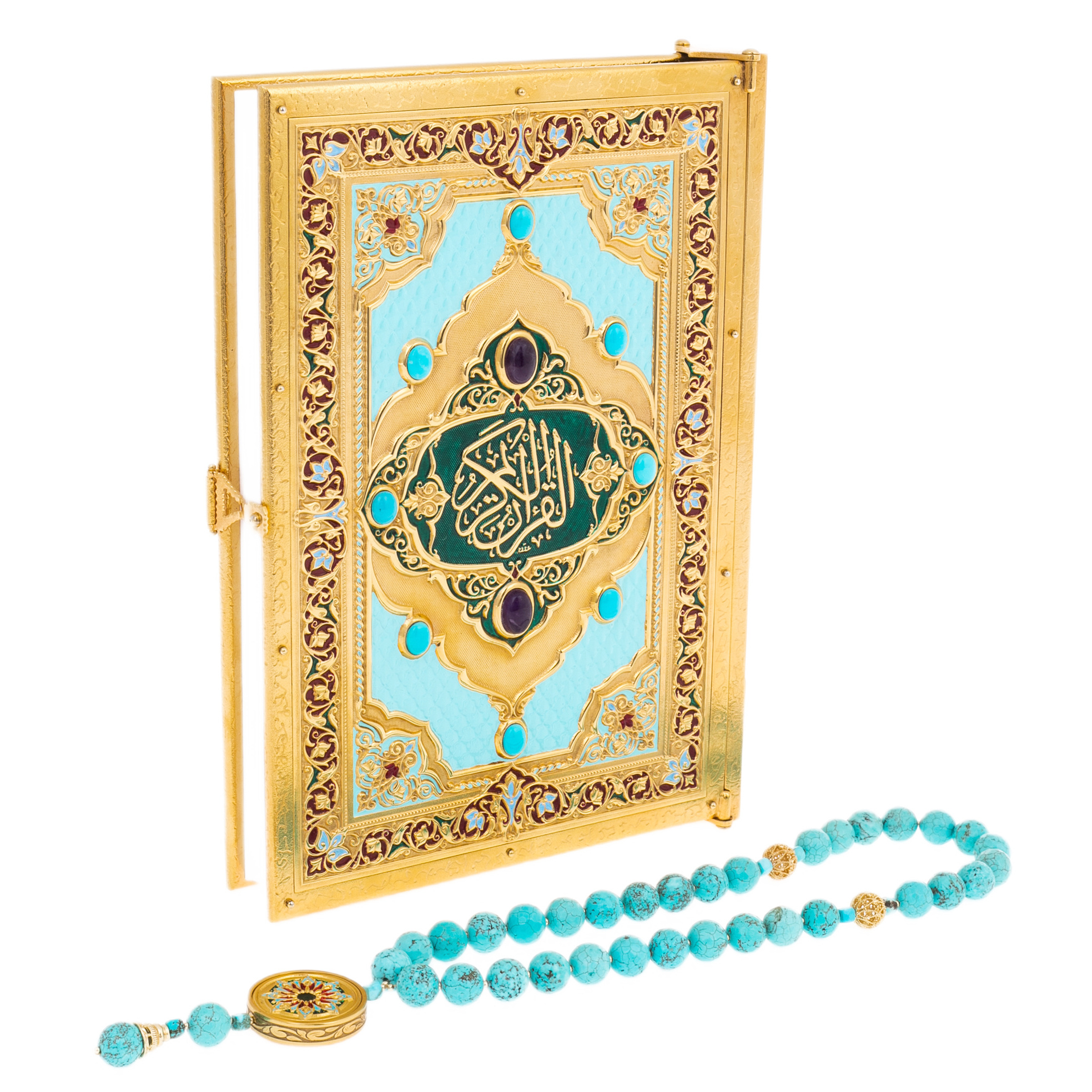 Подарочная книга "Коран с чётками" ОПИСАНИЕ Этот Коран — величественное олицетворение духовной и материальной ценности, созданное искусными мастерами Златоуста. Окутанный роскошью и выполненный с необыкновенной тщательностью, он воплощает древние традиции, привнося в мир своего обладателя не только силу веры, но и мощь изысканного искусства. Сочетание нефрита и золота открывает символическую связь с землей и небом, становясь мостом между физическим и духовным. Изящные арабские надписи, выполненные золотом, добавляют уникальный оттенок изысканности и таинства. Их мягкое сияние словно нашёптывает древние откровения, отражая божественную гармонию и наполняя сердце благоговением. Этот золотой орнамент как бы оживает под взглядом, позволяя прикоснуться к вечному источнику вдохновения и духовной силы. Само золото — воплощение благородства и роскоши, оно окутывает каждую деталь Корана, не просто украшая, но подчеркивая его значимость и ставя на пьедестал, достойный величайших реликвий мира. Легкий отблеск золота, играющий на поверхности обложки, создает ощущение тепла и света, озаряя её и придавая особую значимость для настоящих ценителей прекрасного. Этот Коран станет не просто предметом коллекции, а ценным духовным спутником, отражающим вкус и статус владельца. Он будет напоминать о вековых традициях, о незыблемых основах веры и вечных истинах, а его красота — оставаться символом высокого искусства и утонченной роскоши.