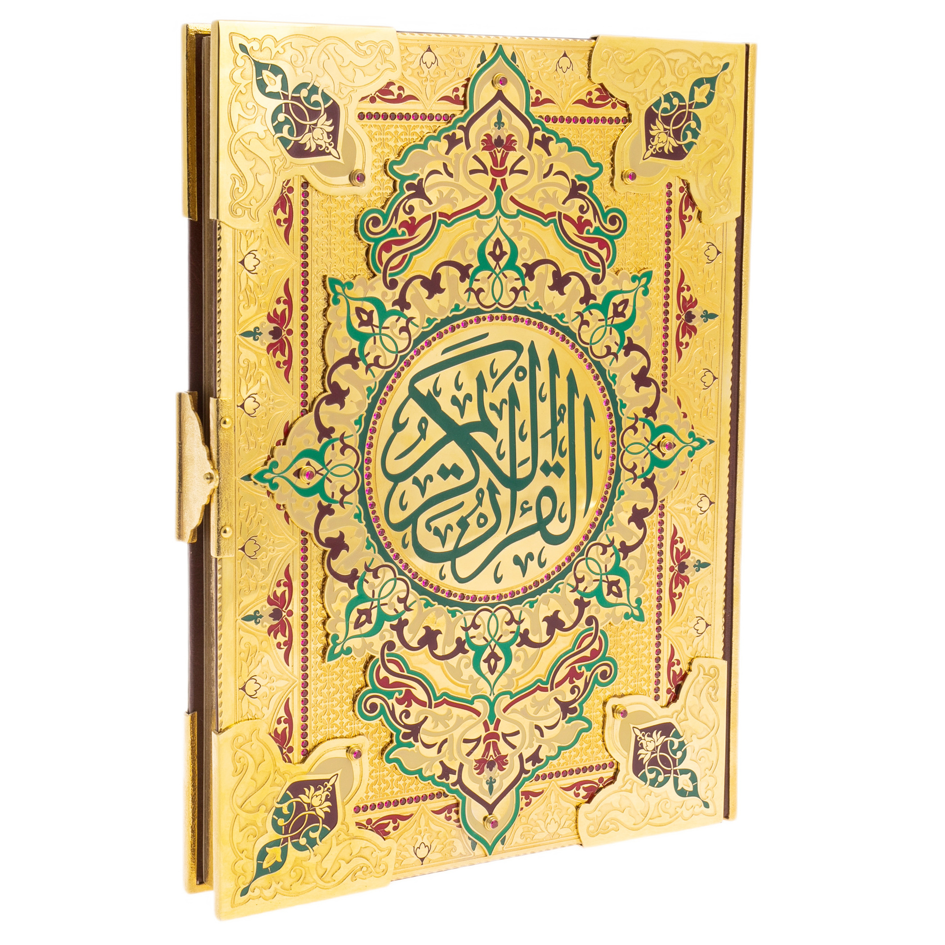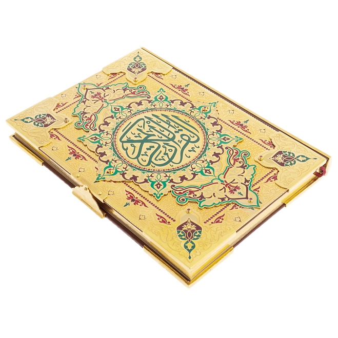 Этот Коран — гимн величию, застывший в золоте и эмали, произведение, в котором древняя священная мудрость обретает достойную оправу. Издание являет собой образец безупречного мастерства, воплощая суть восточного великолепия, той утонченной роскоши, где каждый завиток орнамента, каждая линия каллиграфии звучит как мелодия эпох. Обложка книги — подлинный ювелирный шедевр, исполненный в лучших традициях восточного златоустовского искусства. Основание украшено сложным переплетением узоров, в которых читаются образы цветущих садов Востока, воплощение божественной гармонии и совершенства мироздания. В центре — знаковый символ, выполненный с изысканной точностью, словно сотканный из света. Инкрустация фианитами придает ему глубину сияния, а эмалевые вкрапления — живописную насыщенность. Страницы книги раскрываются подобно драгоценной реликвии, открывая перед читателем мир откровения и чистого знания. Литера тщательно выверена, текст напечатан с безупречной четкостью, а декоративные бордюры обрамляют каждую страницу, подчеркивая святость написанного. Каждый элемент оформления несет в себе не просто красоту, но глубокую смысловую наполненность: орнаменты символизируют вечность, неизменность мудрости, передающейся из поколения в поколение. Золотые застежки, укрепляющие переплет, служат не только украшением, но и символом неприкосновенности, напоминая, что знания, заключенные в этих страницах, подобны несметным сокровищам, хранимым с благоговением. Такое издание — не просто книга, но реликвия, достойная занять место в коллекции избранных. Это знак уважения к традициям, глубокой веры и возвышенного понимания мира. Этот Коран — нечто большее, чем изысканный подарок. Это духовный ориентир, символ силы и благородства, предназначенный для тех, кто ищет не только красоту в вещах, но и смысл, запечатленный в веках.