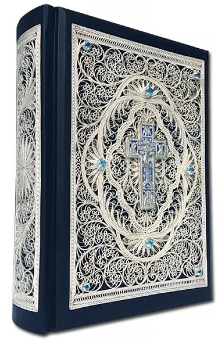 Подарочная книга "Библия" Большая с литьем и филигранью (серебро) и топазами в замшевой шкатулке. ОПИСАНИЕ С индексами для поиска библейских книг По благословению Святейшего Патриарха Московского и всея Руси Алексия II