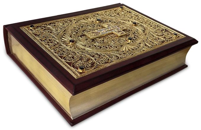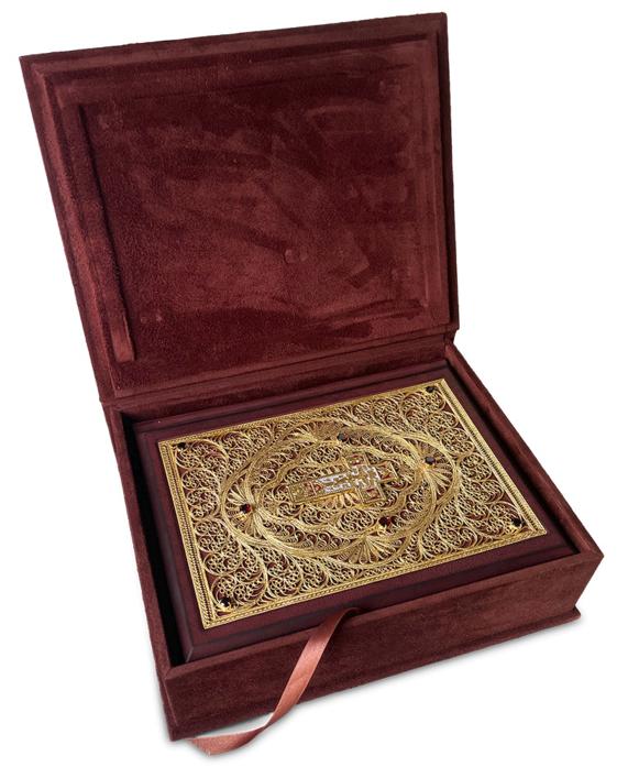 Подарочная книга "Библия" Большая в миниатюрах Палеха с филигранью (золото), гранатами в замшевой шкатулке.