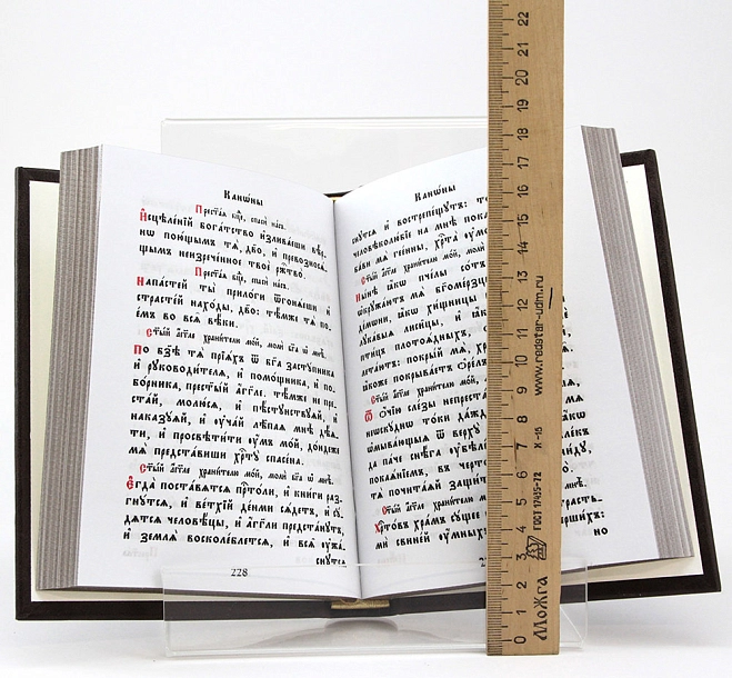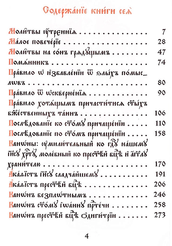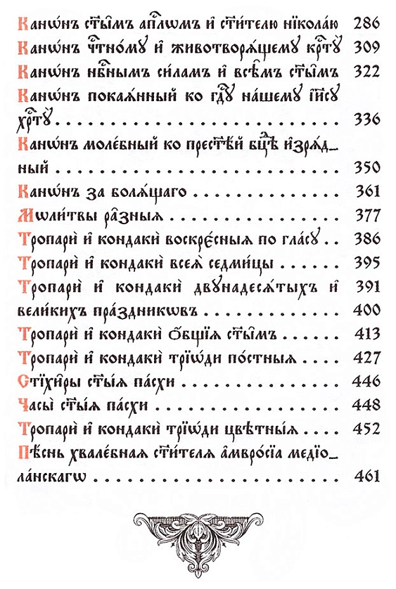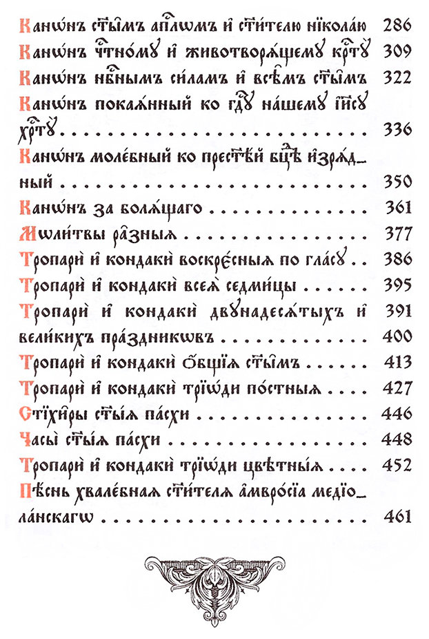 Особенности издания: в каноне ко причащению каждая песнь включает четыре тропаря. Впервые включен канон за болящего по изданию 1854 г. с запевами из Псалтири. Даны тропари и кондаки гласов, седмичные, праздников, из Триодей, общие святым... поемые на малом повечерии. Часы и стихиры Пасхи. Ирмосы Рождественского канона. Песнь “Тебе Бога хвалим”.