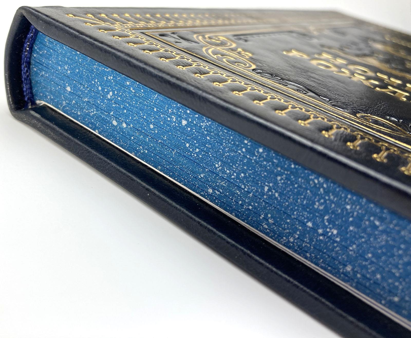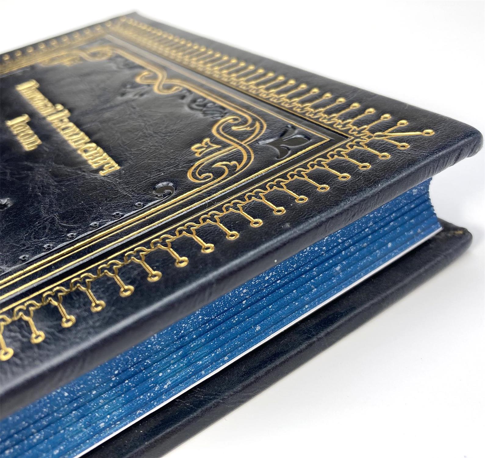 Кожаный переплет ручной работы, золотое и рельефное тиснение. Книжный блок страниц отшлифован и тонирован вручную. Покраска книжного блока с трех сторон с золотыми вкраплениями. Форзац выполнен из дизайнерской бумаги. Только натуральная переплетная кожа, отпечатано на высококачественной бумаге.