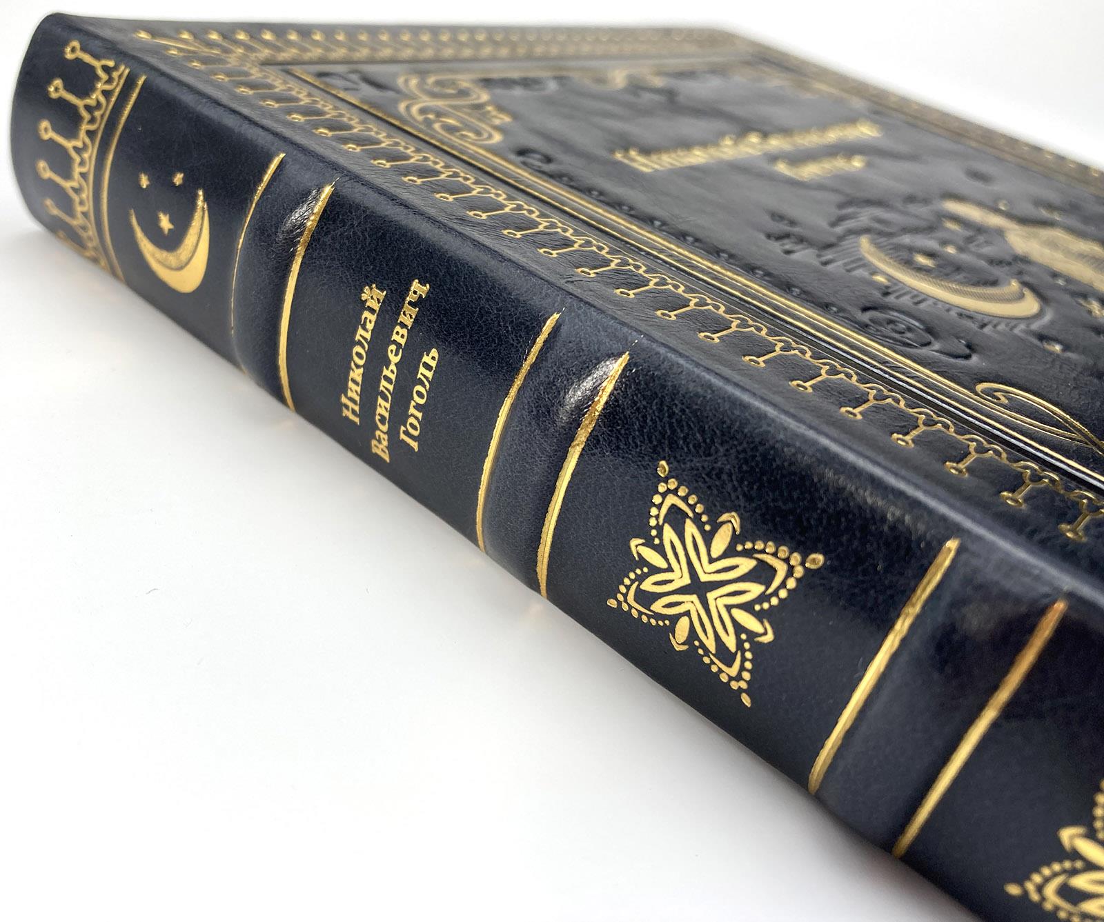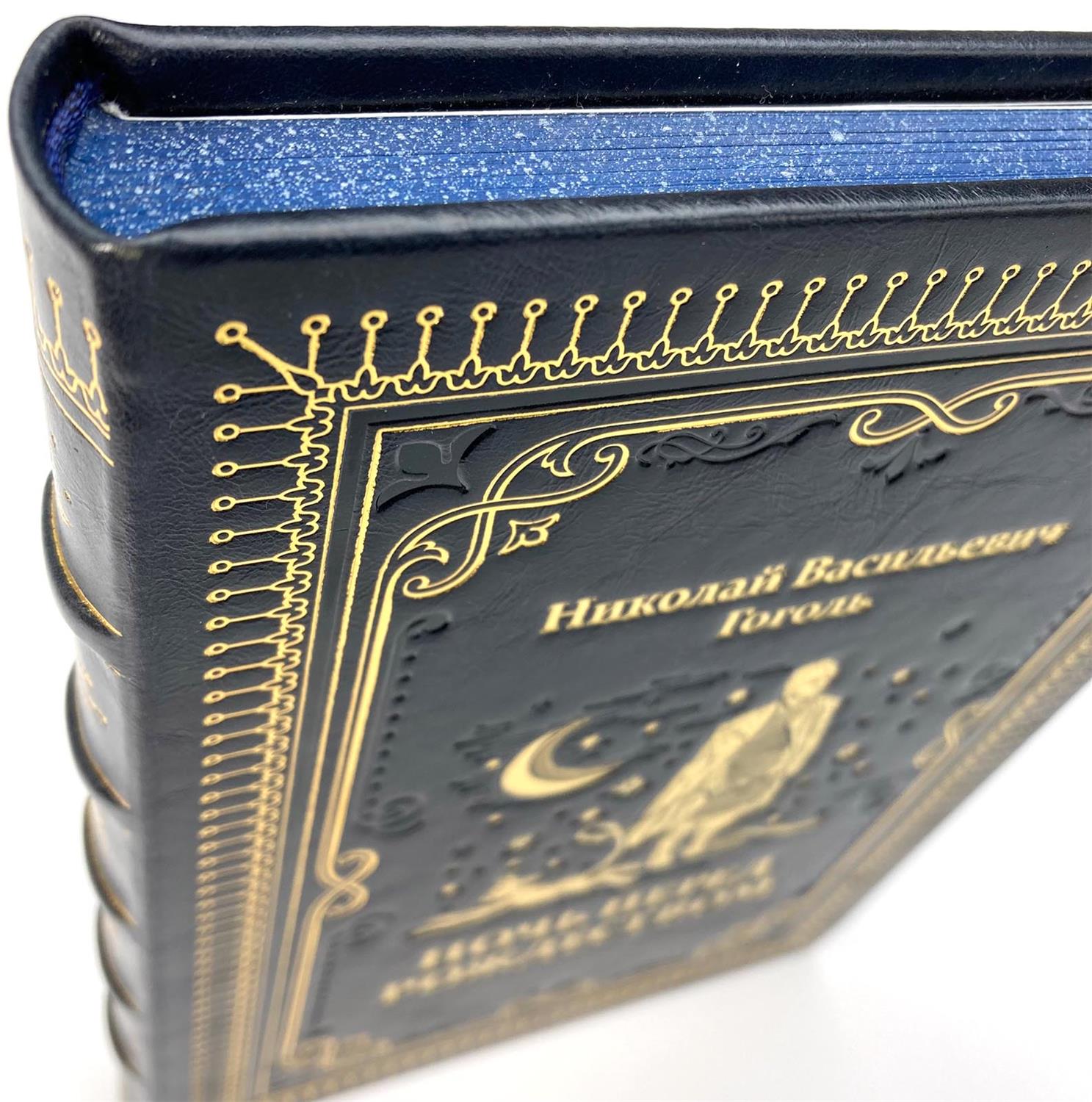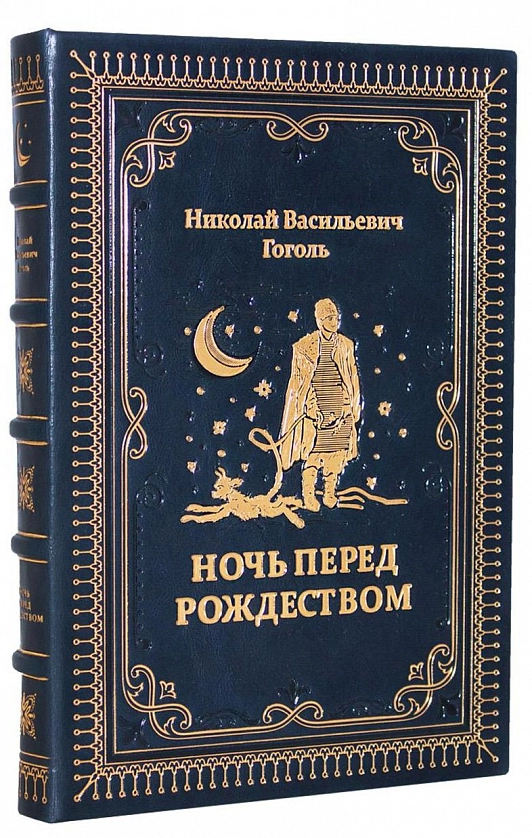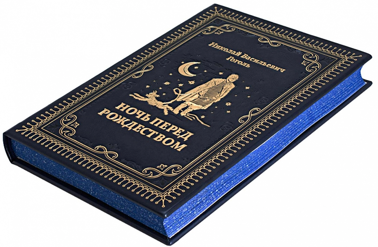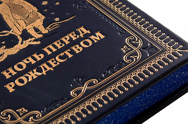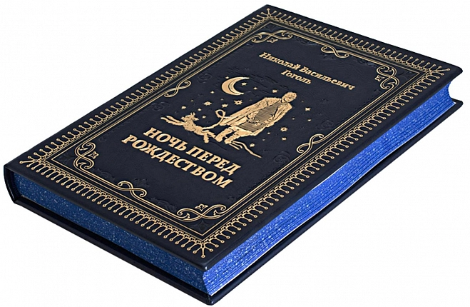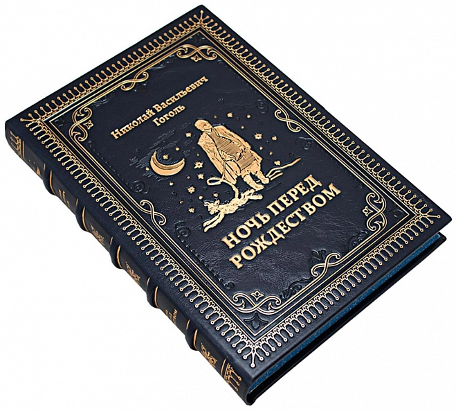 Ночь перед Рождеством, подарочная книга в кожаном переплете. Эту повесть Гоголя мы облачили в переплетную кожу цвета ясной рождественской ночи с золотым тиснением, полностью ручная работа нашей мастерской. Страницы книги имеют индивидуальное оформление и яркие, насыщенные цветами иллюстрации. Это прекрасный экземпляр для подарка дорогому человеку.