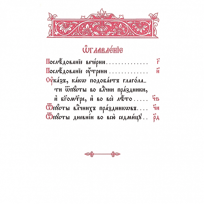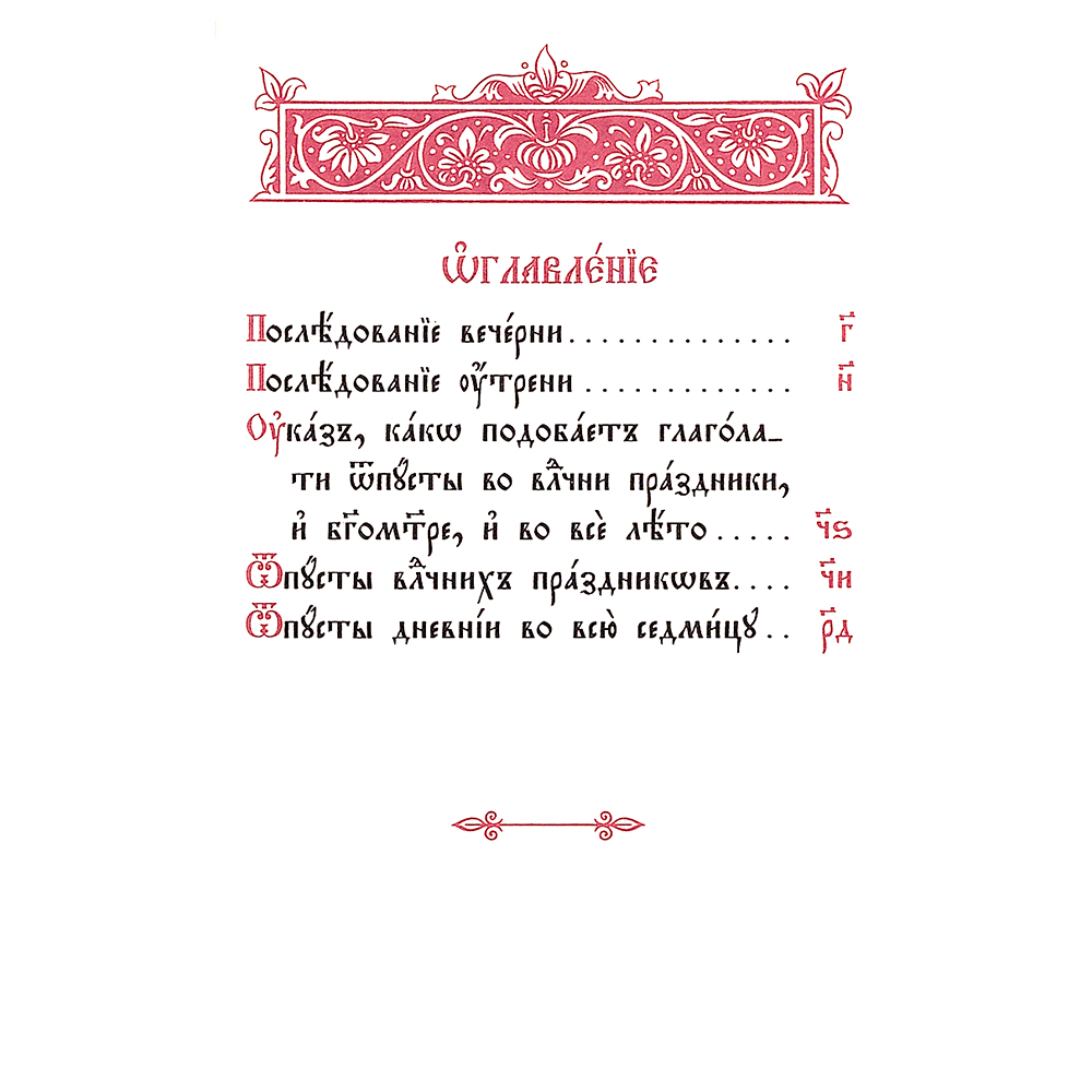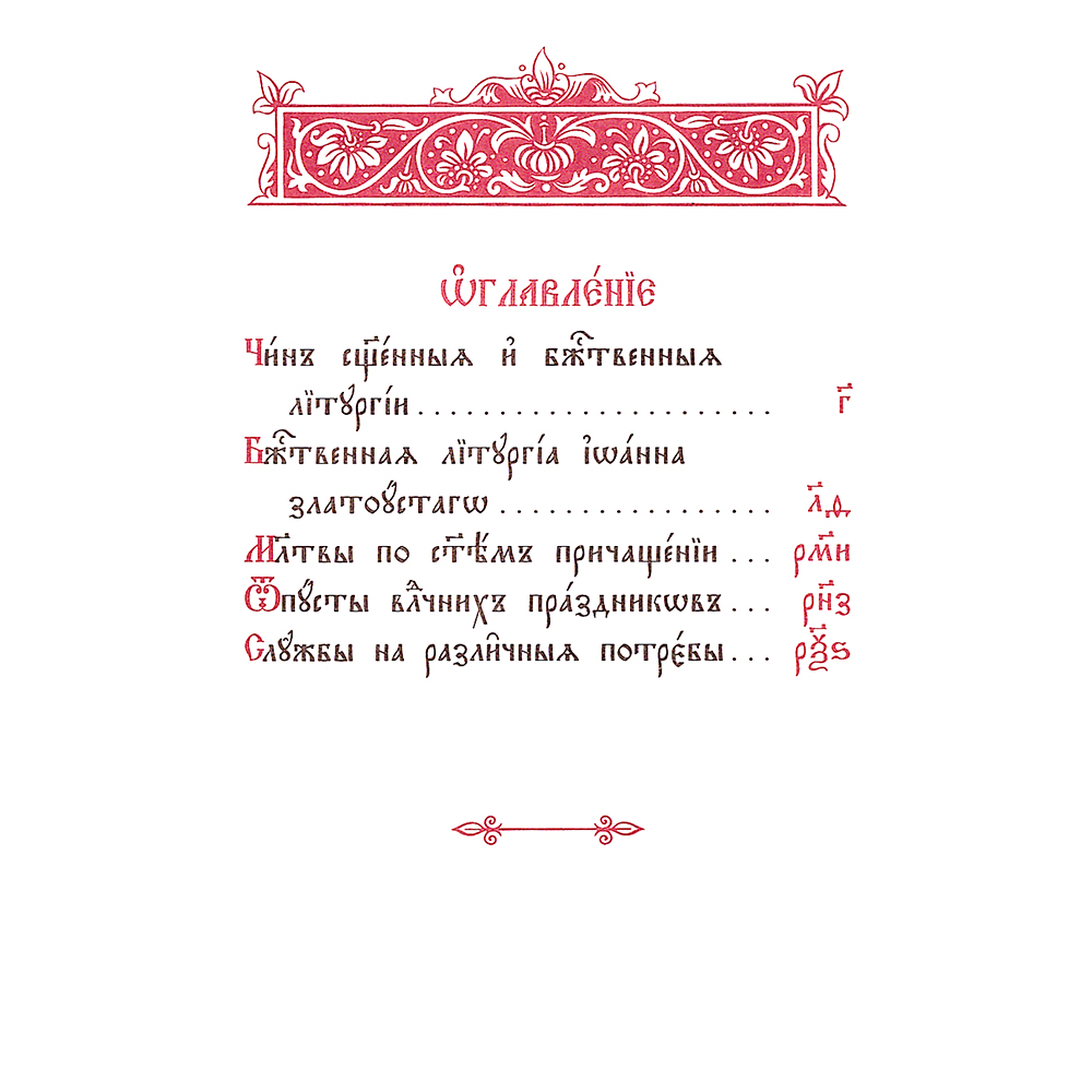 II-IV тома включают чинопоследования трех основных служб православной церкви – Литургии святителя Иоанна Златоуста, Литургии Василий Великого, Литургии Преждеосвященных Даров.