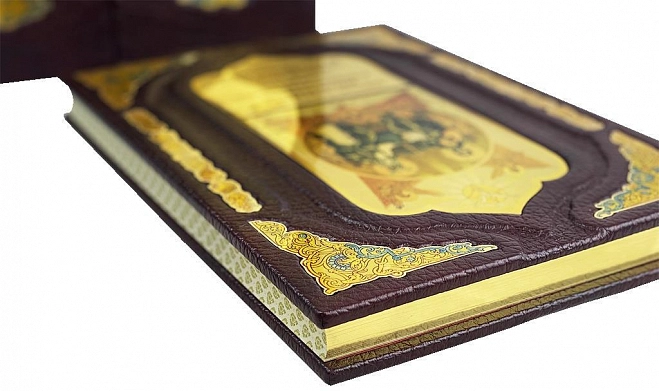 Книга представлена в уникальном подарочном коробе-складне, сделанном из дерева, и обтянутым вручную высококачественной натуральной кожей. Издание оформлено сублимационными табличками, дизайн которых соответствует общей тематике, рисованный обрез, ляссе. Высококачественная бумага.