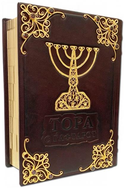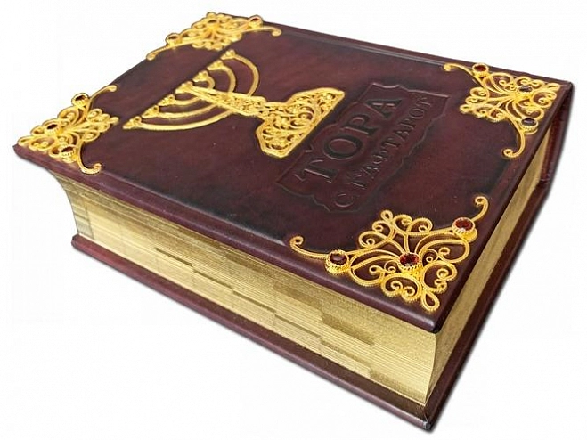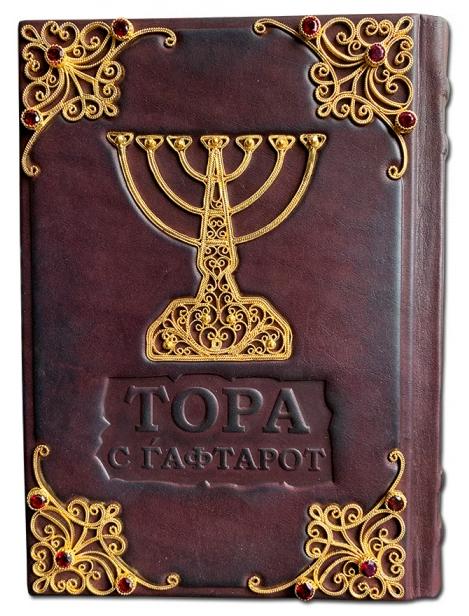 Подарочная книга "Тора с Гафтарот" С филигранью (золото) и гранатами. ОПИСАНИЕ Подарочное издание в кожаном переплете ручной работы с трехсторонним золотым обрезом. В качестве оформления использована филигрань ручной работы, покрытая золотом гальваническим способом, натуральные гранаты. На двух языках: русском и иврите.