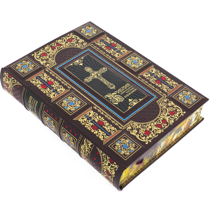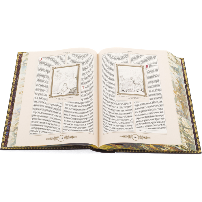 «Библия с иллюстрациями русских художников» объединяет лучшие, поистине выдающиеся произведения русской классической художественной школы XVIII - начала ХХ веков, созданные на темы Священного Писания и являющиеся великим, драгоценным достоянием всей отечественной культуры. В книге ярко и убедительно представлено художественное наследие замечательных мастеров прошлого, посвятивших значительную часть своего творчества библейским сюжетам. Среди художников, творческая деятельность которых нашла отражение в «Библии...», такие выдающиеся имена, как В. Боровиковский, Ф. Бруни, К. Брюллов, А. Иванов, В. Поленов, Н. Ге, В. Врубель, В. Васнецов, а также - А. Лосенко, Н. Чернецов, А. Агин, А. Рябушкин и другие. «Библия с иллюстрациями русских художников» включает в себя полный текст Священного Писания Ветхого и Нового Заветов на русском языке (по Синодальному изданию Библии), сопровождающийся 250 иллюстрациями, размещенными по всей книге, где подробно описываются каждая из них. Эта книга, без сомнения, станет памятником величия и славы отечественного художественного искусства, которая по праву является гордостью Российской Державы. Следует отметить, что в XIX веке в Реестре государственных наград Российской Империи упоминалась Наградная Библия. «Библия с иллюстрациями русских художников» возрождает многолетнюю традицию Наградной Библии, которая в старой России вручалась за особые заслуги перед Русской Православной Церковью и Российским государством.