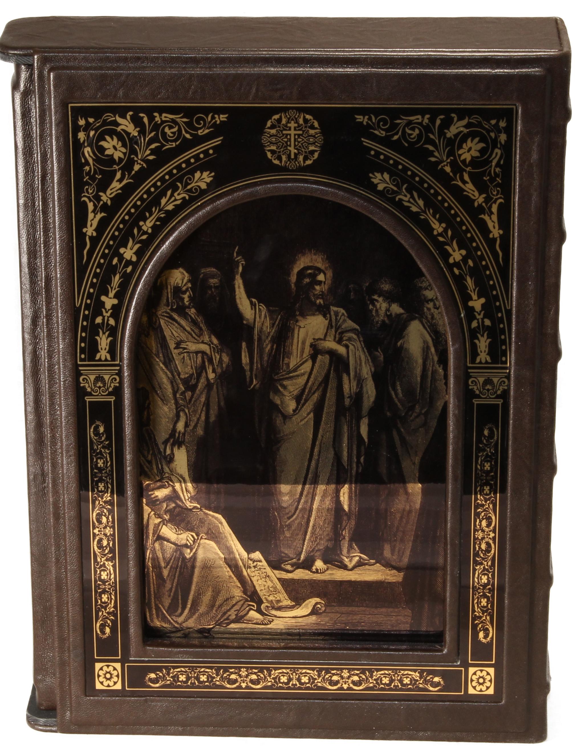 Библия в гравюрах Гюстава Доре АННОТАЦИЯ Стильно оформленное подарочное издание в кожаном переплете с трехсторонним золотым обрезом. "Разными путями Бог открывает нам Свою любовь и истину — как через вечное живое Слово Свое, так и через непосредственное, личное общение с Ним". ОПИСАНИЕ Цельнокожаный переплёт ручной работы, украшен иллюстрированной вставкой из цветного металла. Обложка двухуровневая. Текст книги напечатан на мелованной бумаге и дополнен чёрно-белыми иллюстрациями. Ляссе из шёлковой ленты. Форзац цельный из дизайнерской бумаги. Футляр кожаный, вдохновлён дизайном книги. Книга представлена в оригинальном подарочном коробе, перчатки, по желанию сертификат (может быть именным) в комплекте. Цветовое сочетание переплёта и упаковки может отличаться от представленных на фото.