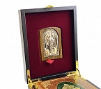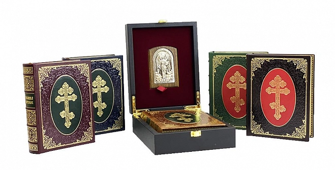 Оригинальный подарочный набор включает в себя книгу в кожаном переплете «Православный молитвослов» и икону «Ангел-Хранитель», оформленных в деревянной коробке, обтянутой кожей.