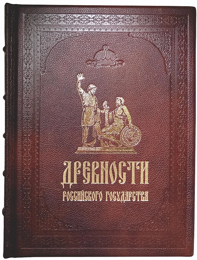 Подарочная книга "Древности Российского государства" АННОТАЦИЯ Древности Российского государства - серьезный научный труд, своеобразный каталог памятников отечественной истории - был выпущен в Москве в течение 1849 - 1853 годов. Издание состояло из альбомов, включивших в себя свыше 500 листов цветных хромолитографий отечественных памятников культуры и тетрадей текстового печатного материала. Его появление на свет связано с развитием в XIX веке так называемой художественной археологии, родоначальником которой принято считать художника Ф. Солнцева. По предписанию президента Академии художеств А.Н. Оленина с 1830 года на протяжении двадцати с лишним лет он совершал многочисленные поездки по старинным русским городам, монастырям и церквям, где тщательно зафиксировал памятники истории и культуры. Результатом этой деятельности стало огромное наследие - больше пяти тысяч красочных акварелей и рисунков, часть которых и вошла в Древности Российского государства. Среди них - несохранившиеся до наших дней предметы из Патриаршей ризницы Московского Кремля, кремлевского Успенского собора, храмов и монастырей Новгорода и других городов.Впервые в нашей стране переиздается в полном виде труд такого объема и значимости, повествующий об истории допетровской России. В издание включены не только замечательными иллюстрациями известного художника Ф. Солнцева (более 500), но и не уступающие им по ценности статьи, написанные прекрасным живописным языком такими выдающимися литераторами, как А. Вельтман, известный отечественному читателю и зрителю благодаря роману и одноименному телефильму «Саломея», М. Загоскин, И. Снегирев и другие. Эта книга станет прекрасным пособием для преподавателей истории, деятелей театра и кино, а также для самого широко круга читателей. Издание особенно актуально в настоящее время, когда интерес к отечественной истории высок как никогда. Поскольку оригиналы рисунков Ф. Солнцева приходилось собирать по крупицам, подобное издание в последующем осуществить будет практически не возможно. ОПИСАНИЕ Переплет ручной работы. Натуральная переплетная кожа. Каптал из шелковых нитей. Ляссе шелковое. Обрез торшонированный золотой фольгой. Украшение переплета: тиснение полиграфической фольгой, блинтовое тиснение, ювелирное литье с золочением.