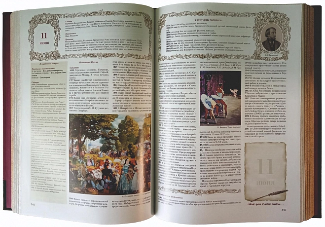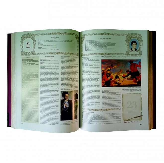 Летописный календарь России АННОТАЦИЯ Книга посвящена истории России и освещает каждый день года. Богато оформленное (около 1 000 иллюстраций) издание включает более 20 000 сообщений, в которых в хронологическом порядке изложена история нашей страны и наиболее значимые зарубежные события. Помимо исторических фактов, «Летописный календарь России» предлагает интересные данные об аномальных явлениях и предсказаниях; в книге также представлены народные приметы, праздники, святцы и именины. Все эти сведения строго датированы, выстроены в хронологическом порядке и дают полное представление обо всех значимых событиях каждого дня года. Даты российских событий до 1918 года даны по старому стилю. Это уникальное издание как в нашей стране, так и за рубежом. ОПИСАНИЕ Составной переплет ручной работы. Натуральная переплетная кожа. Каптал из шелковых нитей. Ляссе шелковое. Обрез торшонированный золотой фольгой. Украшение переплета: тиснение полиграфической фольгой.