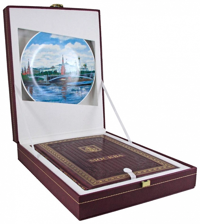 Подарочный набор с тарелкой "Москва" АННОТАЦИЯ ТЕКСТ ИЗ ФАЙЛА ОПИСАНИЕ Книга «Москва»: Переплёт ручной работы из натуральной кожи. Форзац выполнен из дизайнерской бумаги. 4 бинта на корешке, ручной обработки. Обрез блока торшонированный золотой. Каптал золотой из натуральной кожи. Тиснение блинтовое и золотой фольгой. Ляссе. Размер 195х273х24 мм; Тарелка: авторская ручная роспись, выполненная в технике Майолика. Диаметр: 204 мм Коробка с прошивкой, на замке, с ложементом. картон/эко-кожа armonia 244х315х80 мм
