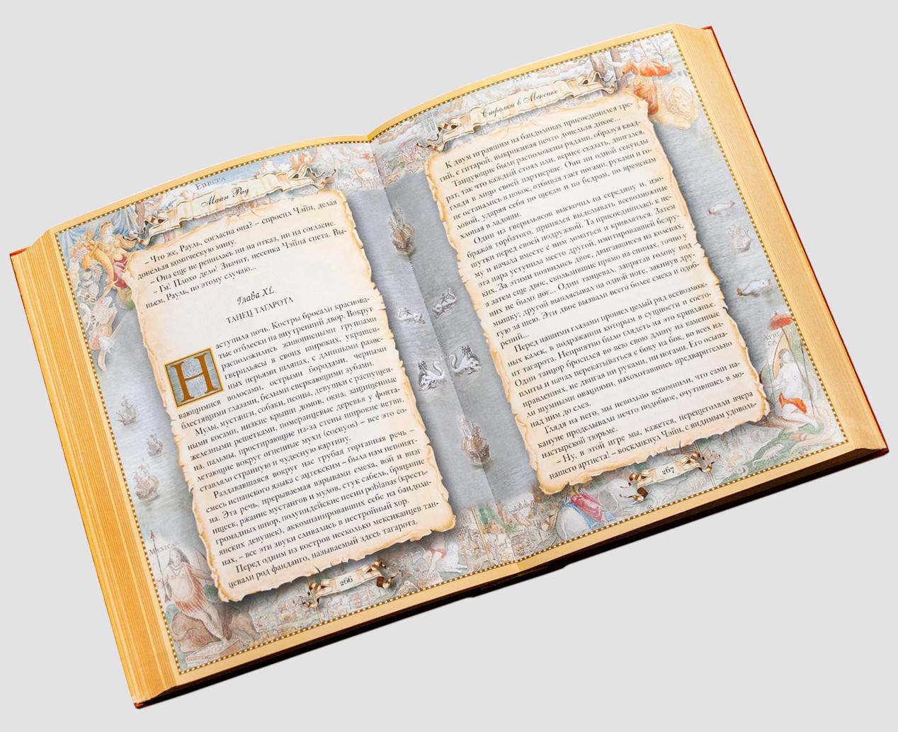 Трехсторонний золотой обрез, роскошный классический переплет, украшенный тиснением золотой и серебряной фольгой, шелковое ляссе, продуманный формат, цветные иллюстрации старинных зарубежных и современных российских художников, позволят изданию найти достойное место в коллекции того, кто ценит книги, созданные с высоким художественным вкусом и мастерством. Украшенные золотом и оригинальной подложкой в виде старинной карты страницы, похожие на старые свитки, завершают оформление и создают особую атмосферу книг.