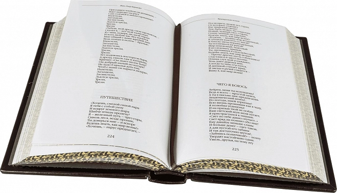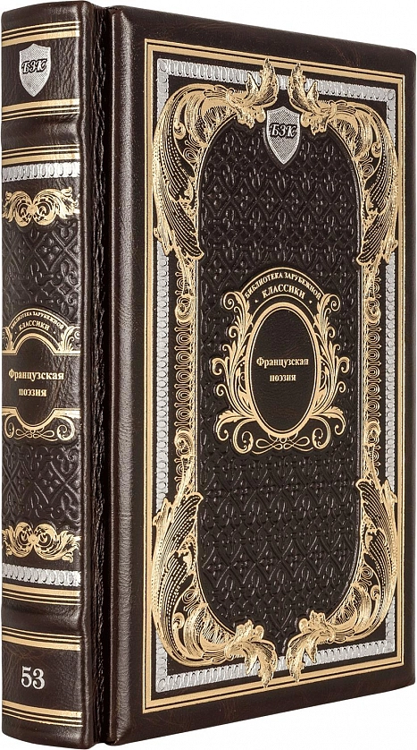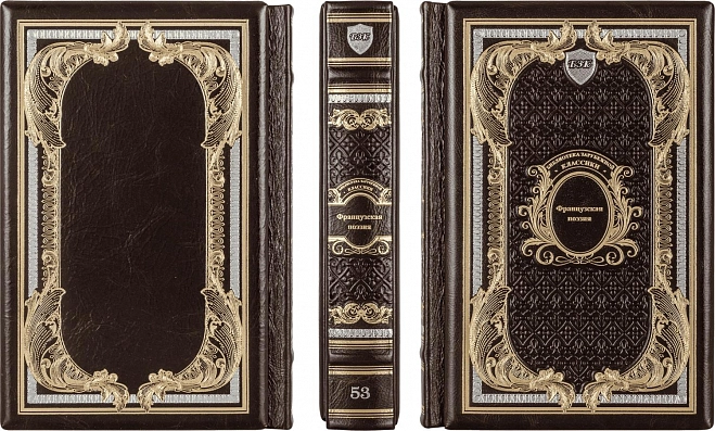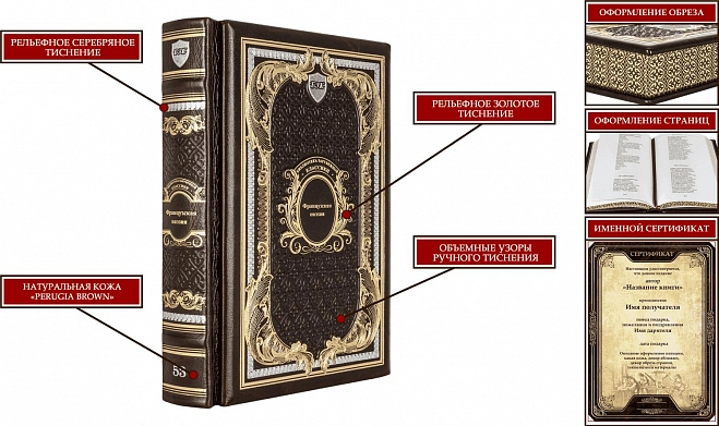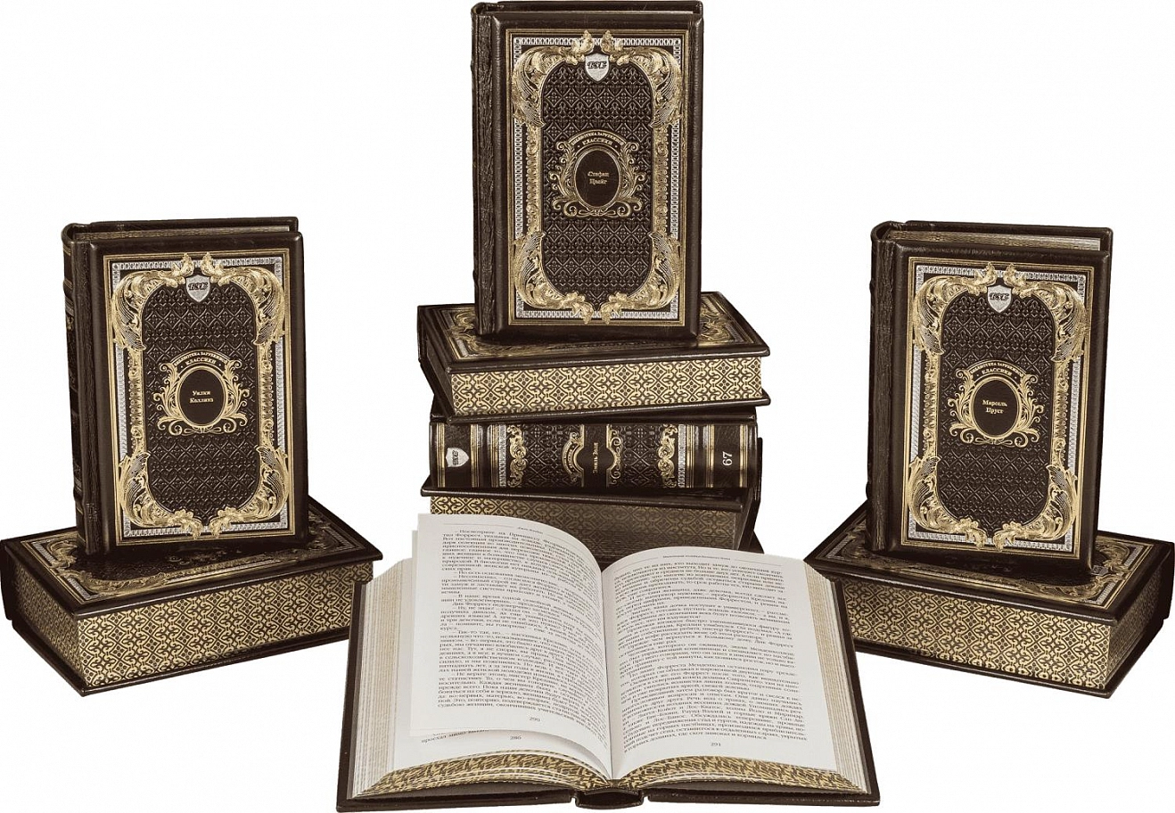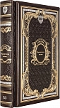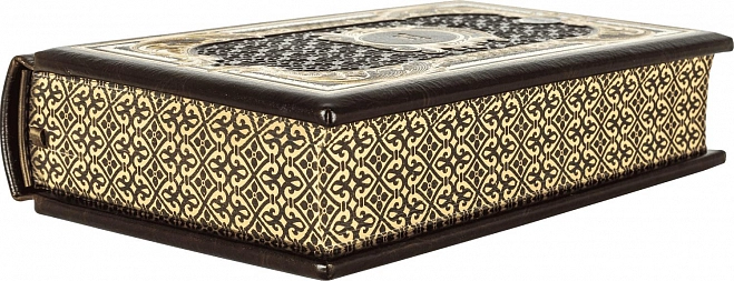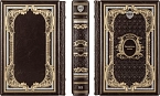 Составной переплет «Брадель» ручной работы, выполнен из натуральной кожи «Robbat Wisky» производства кожевенной итальянской фабрики «Claudio». Обложки оформлены глубоким блинтовым и рельефным золотым и серебряным тиснением, с использованием золотой фольги «Luxor 240». Обрезы книг выполнен в авторской технике золочения с нанесением орнамента.По желанию клиента на заднюю обложку каждого тома может быть оттеснена семейная монограмма(суперэкслибрис), что переводит собрание в разряд фамильной библиотеки, которая будет передаваться из поколения в поколение.