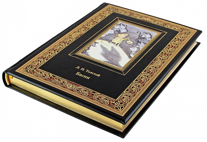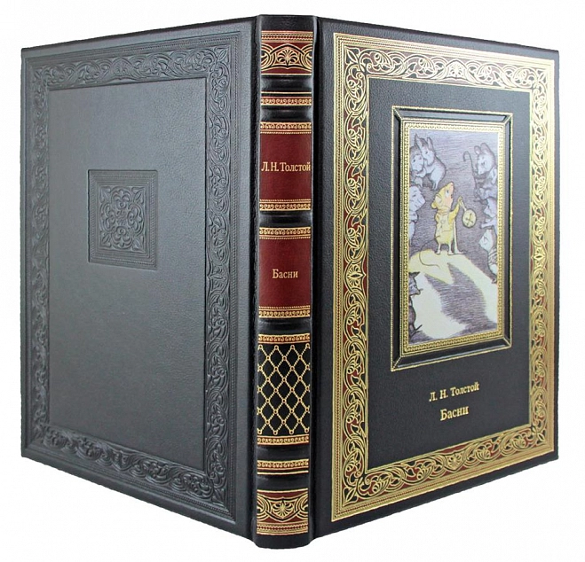БМЛ "Басни" Толстой Л. Н. АННОТАЦИЯ Сборник включает 183 басни классика мировой литературы Л. Н. Толстого; из них 114 написаны по сюжетам Эзопа, 34 — по сюжетам индийских сказок и басен, 13 являются переработкой басен Лафонтена, 8 написаны на сюжеты из разных источников и 14 сочинены самим писателем. В конце издания даны обширные комментарии. Книгу украшают более трех сотен черно-белых и цветных иллюстраций, выполненных современной художницей Ксенией Алексеевой. ОПИСАНИЕ Классический европейский переплёт ручной работы из натуральной кожи. Форзац из дизайнерской бумаги Malmero с тиснением орнамента золотой фольгой. 6 бинтов на корешке, ручной обработки. Каптал золотой из натуральной кожи. Обрез блока - золото с торшонированием. Тиснение блинтовое, золотой и цветной фольгой. Ляссе. Инкрустация кожаной вставкой с полноцветной печатью. Вес 1100г