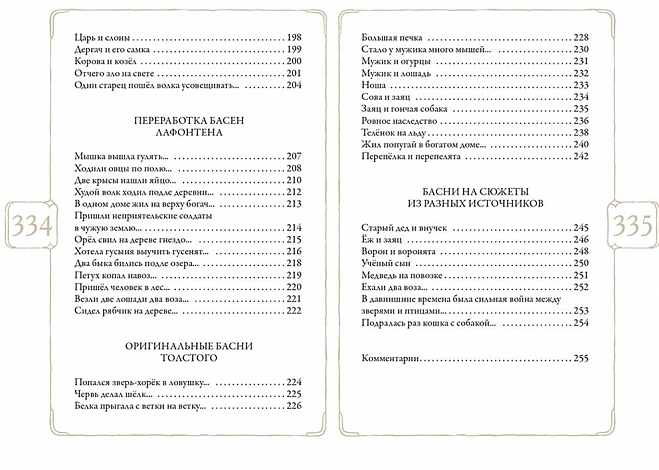 Сборник включает 183 басни классика мировой литературы Л. Н. Толстого; из них 114 написаны по сюжетам Эзопа, 34 — по сюжетам индийских сказок и басен, 13 являются переработкой басен Лафонтена, 8 написаны на сюжеты из разных источников и 14 сочинены самим писателем. В конце издания даны обширные комментарии. Книгу украшают более трех сотен черно-белых и цветных иллюстраций, выполненных современной художницей Ксенией Алексеевой.