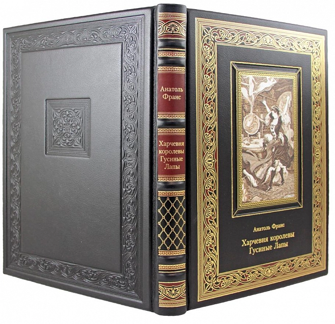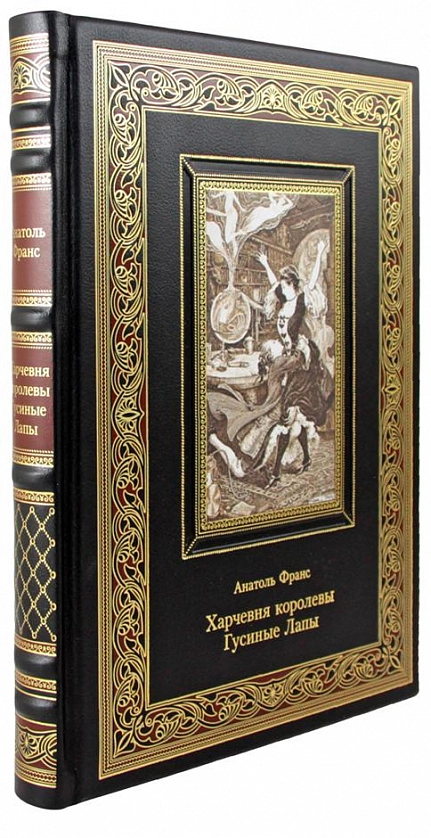 БМЛ "Харчевня королевы Гусиные Лапы" Анатоль Франс АННОТАЦИЯ Впервые сатирический роман «Харчевня королевы Гусиные Лапы» был опубликован в 1892 году. Его автор — всемирно известный писатель, нобелевский лауреат по литературе Анатоль Франс (1844–1924) — предстает перед чита- телями как утонченный философ, остро критикующий окружающую действительность и следящий за нравственным падением людей, которых он, тем не менее, принимает со всеми их слабостями и пороками. Текст публикуется в переводе Надежды Михайловны Жарковой. Книгу украшают изящные рисунки английского художника и книжного иллюстратора Франка Чейна Папе (1878–1972). ОПИСАНИЕ Классический европейский переплёт ручной работы из натуральной кожи. Форзац из дизайнерской бумаги Malmero с тиснением орнамента золотой фольгой. 6 бинтов на корешке, ручной обработки. Каптал золотой из натуральной кожи. Обрез блока - золото с торшонированием. Тиснение блинтовое, золотой и цветной фольгой. Ляссе. Инкрустация кожаной вставкой с полноцветной печатью. Вес 550г