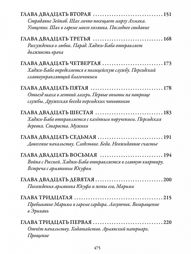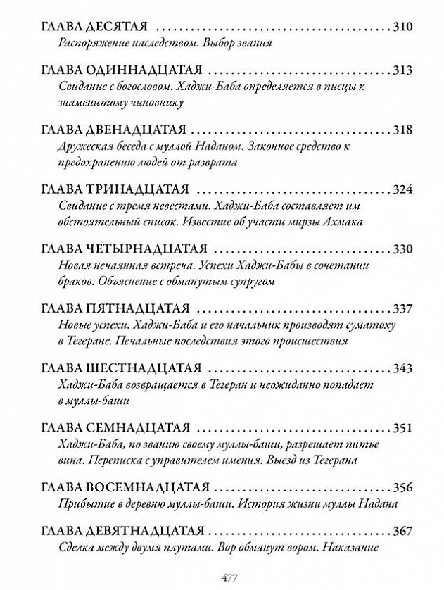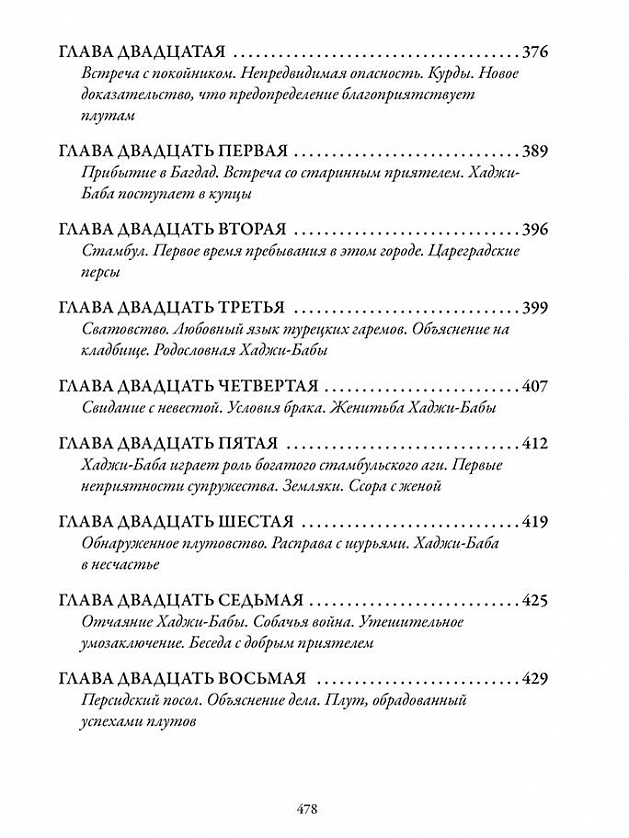 Роман «Похождения Хаджи-Бабы из Исфагана» — наиболее известное про- изведение английского дипломата и писателя Джеймса Джастина Мориера (1780–1849). Главный герой романа, слегка напоминающий Ходжу Насред- дина или Тиля Уленшпигеля, беспощадно высмеивает человеческую подлость, ханжество и лживость. Текст в блестящем переводе полиглота Осипа Сенков- ского позволяет в полной мере насладиться атмосферой восточного мира. Из- дание украшают рисунки шотландского художника XIX в. Гарольда Миллара и американского живописца Сайруса Болдриджа."
