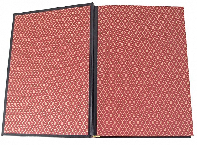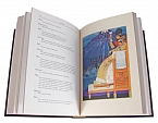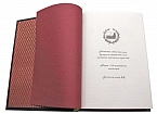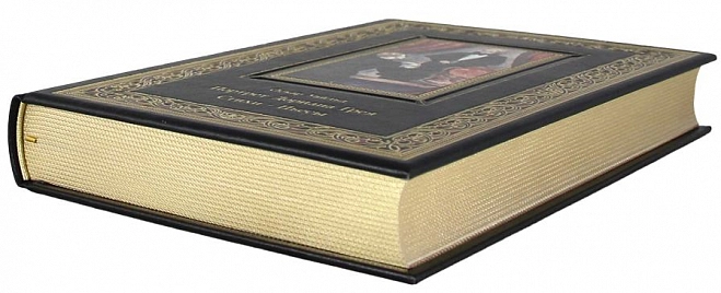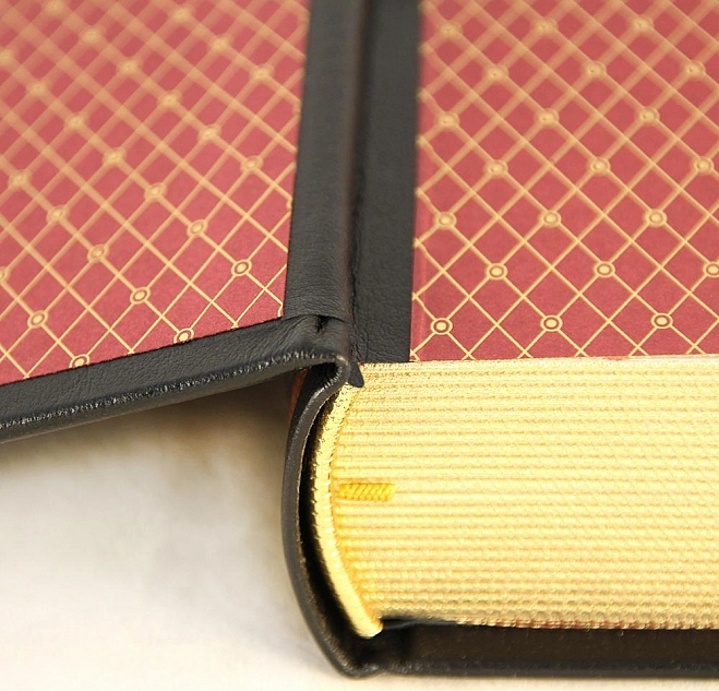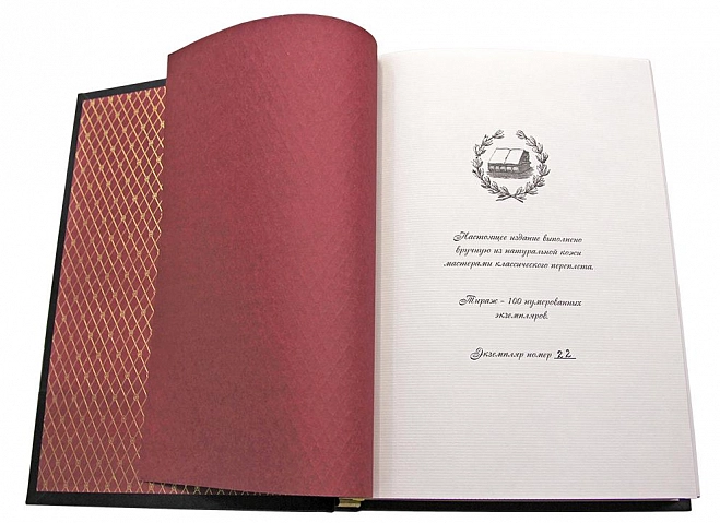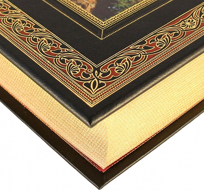 Классический европейский переплёт ручной работы из натуральной кожи. Форзац из дизайнерской бумаги Malmero с тиснением орнамента золотой фольгой. 6 бинтов на корешке, ручной обработки. Каптал золотой из натуральной кожи. Обрез блока - золото с торшонированием. Тиснение блинтовое, золотой и цветной фольгой. Ляссе. Инкрустация кожаной вставкой с полноцветной печатью. Вес 1350г