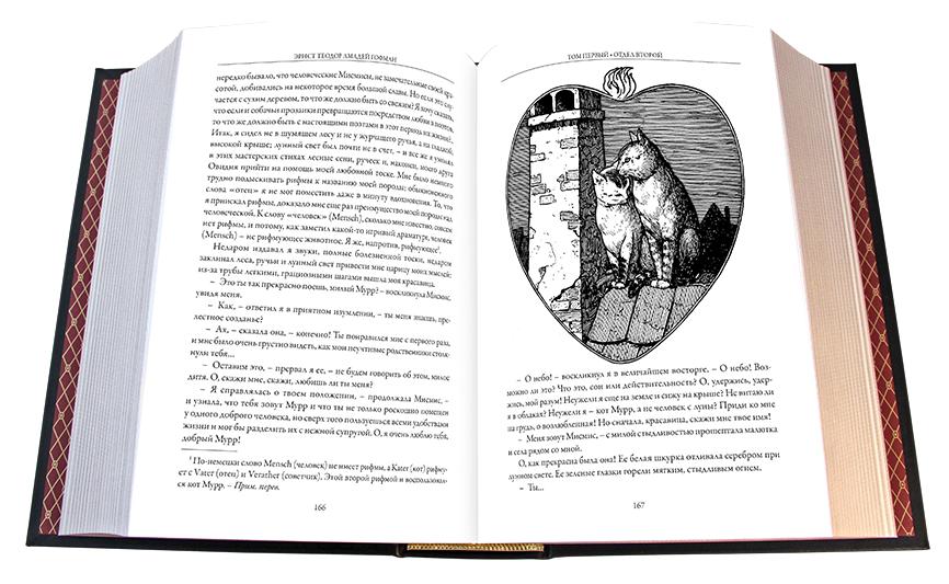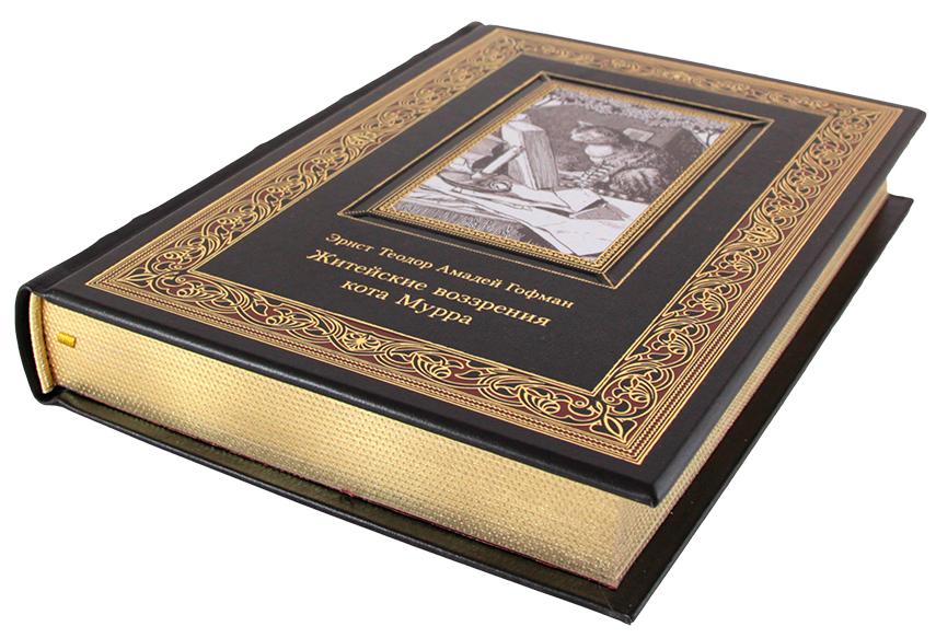 БМЛ "Житейские воззрения кота Мурра" Эрнст Теодор Амадей Гофман АННОТАЦИЯ Знаменитый немецкий писатель-романтик Эрнст Теодор Гофман считал «Житейские воззрения кота Мурра» одним из лучших своих произведений. Повествование в этом романе ведется от имени ученого кота, но оно порой прерывается фрагментами биографии капельмейстера Крейслера. Современ- ные читатели найдут в этой книге и едкую сатиру, и искрометный юмор, и философские размышления о жизни. Текст романа дан в переводе М. А. Бе- кетовой под редакцией З. А. Вершининой. Издание украшают рисунки двух немецких художников — Эрнста Либерманна и Вальтера Велленштейна. ОПИСАНИЕ Классический европейский переплёт ручной работы из натуральной кожи. Форзац из дизайнерской бумаги Malmero с тиснением орнамента золотой фольгой. 6 бинтов на корешке, ручной обработки. Каптал золотой из натуральной кожи. Обрез блока - золото с торшонированием. Тиснение блинтовое, золотой и цветной фольгой. Ляссе. Инкрустация кожаной вставкой с полноцветной печатью. Вес 810г