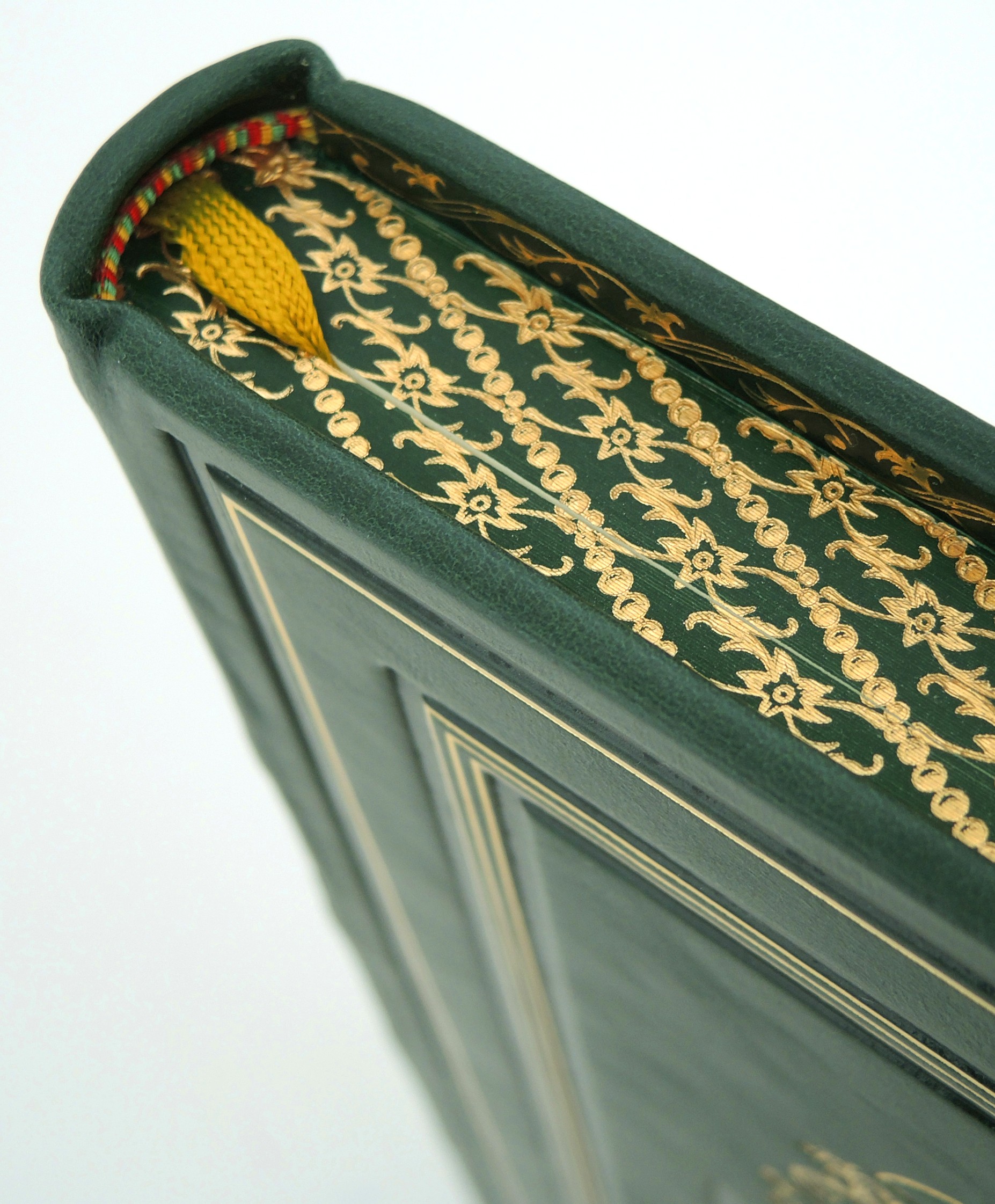 Книга исполнена по старинной французской технологии; Переплет цельнокожаный, из искусственно застаренной кожи; Художественное двухцветное тиснение на обложке и корешке; вставки из шагреневой кожи другого цвета. Бумага дизайнерская, кремовая, из коллекции Olin (Франция); Блок сшит на пяти шнурах; Форзац выполнен из мраморной бумаги ручного крашения; Дублюра окатана вручную 23-каратным золотом; Обрез блока с художественным оформлением: окрашен и гравирован вручную; Ляссе шелковое, каптал ручного плетения; Индивидуальный футляр.