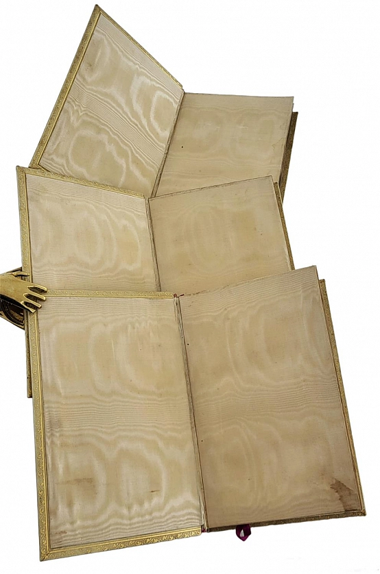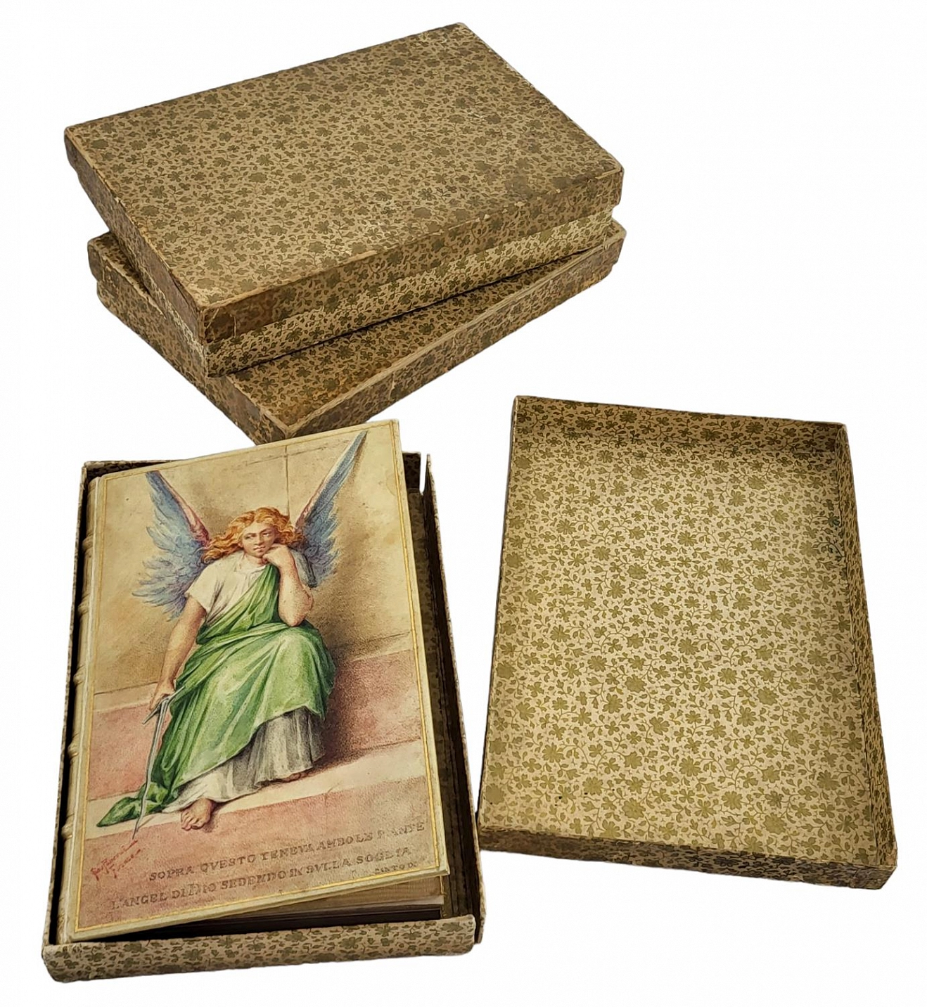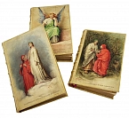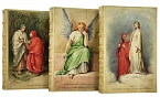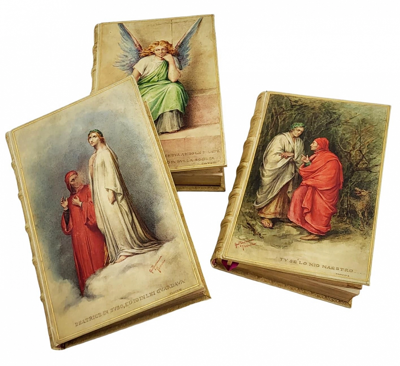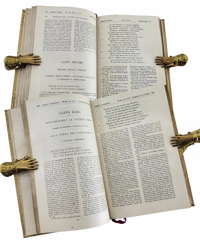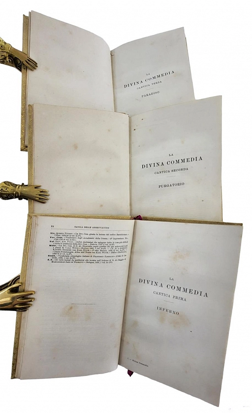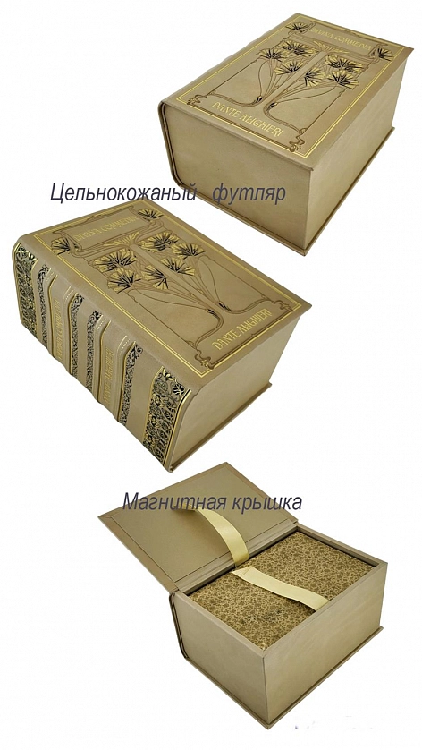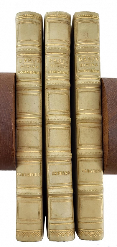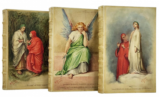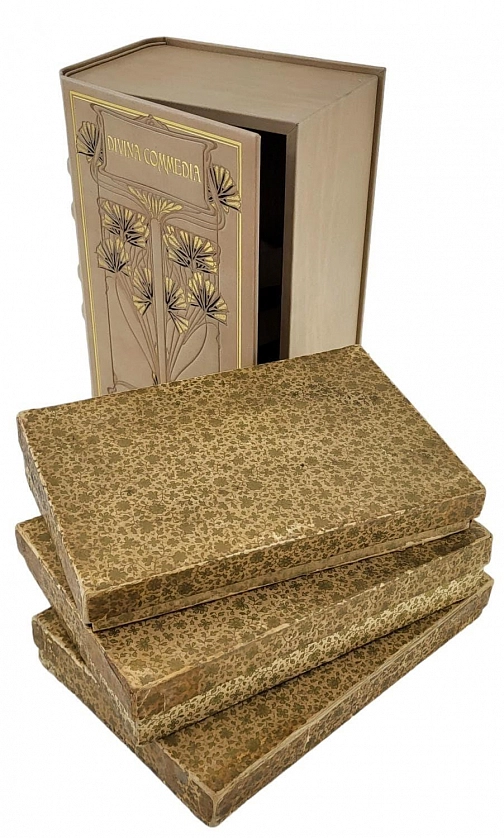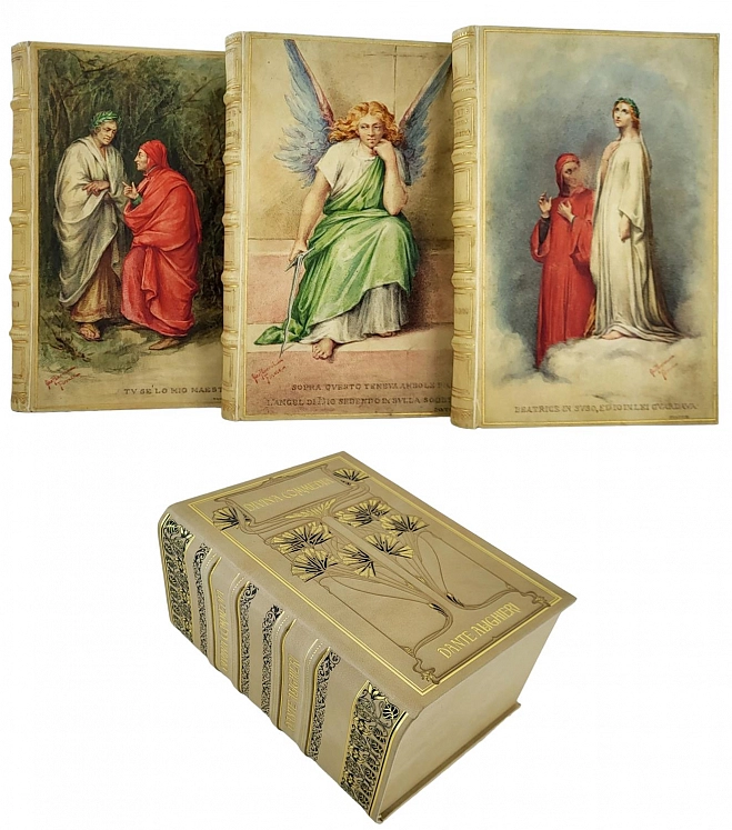 La Divina Commedia di Dante Alighieri. Милан, Издатель – Ulrico Hoepli, 1896. Текст выверен и откомментирован Дж.А. Скартаццини. Исправлено и дополнено доктором Луиджи Поллаком. Второе издание. Формат 12,5 х 19,5 см. Оригинальные переплеты эпохи (французский переплет), натуральная кожа пергамент, шелковый муар, золотые обрезы, ручное тиснение золотом 22 К. Ручная, авторская роспись по коже. Каждый том в индивидуальной коробочке (1896). Комплект помещен в подносной цельнокожаный футляр с художественным тиснением. Идеальная сохранность.