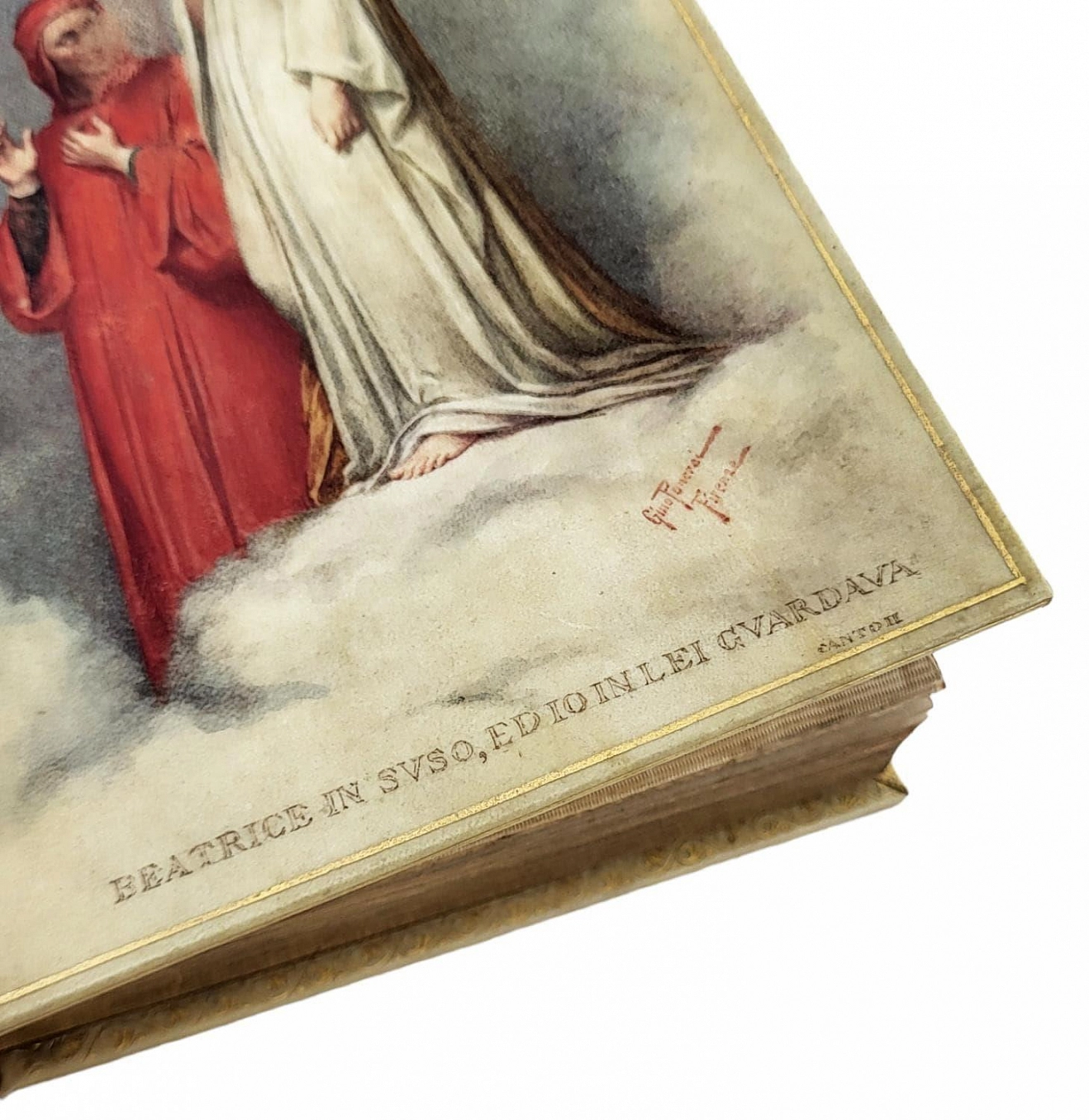 Пергаментные переплеты, украшенные авторскими картинами, собственноручно написанными известным итальянским художником Джино Панкраем (Gino Pancrai, Фиренца, работал в 1890-х – 1920-х гг.). Данные художественные переплеты были изготовлены в очень ограниченном количестве (вероятно, несколько экземпляров) по заказу издателя и одного из выдающихся исследователей и почитателей Данте, ученого-археолога, искусствоведа, неоднократно курировавшего издания Данте у Hoepli – Коррадо Риччи.