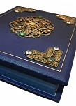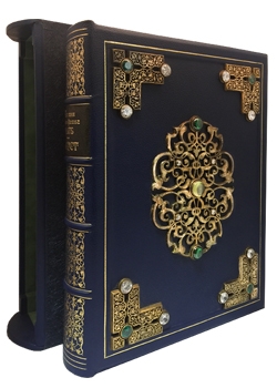 Подарочная книга "Фауст" Экземпляр № 04 АННОТАЦИЯ Еще одно из величайших произведений мировой литературы в оформлении по принципам серии: это энциклопедическое издание содержит более 1200 иллюстраций, в том числе из лучших изданий прошлого века. Многочисленные приложения: прозаический перевод сцены Вальпургиева ночь А.Л. Соколовского, комментарии, алфавитный указатель имен действующих лиц, алфавитный указатель мифологических имен и исторических лиц, алфавитный указатель географических названий, предметный указатель, библиография. ОПИСАНИЕ Французский цельнокожаный переплет ручной работы. Кожа натуральная, цвет синий (Англия). Форзац раздельный на кожаной слизуре. Каптал шелковый ручного плетения. Тиснение золотой фольгой. Обрез окрашенный и полированный с трех сторон. Ювелирные украшения переплета - общий вес 433 грамма. Серебро 925-й пробы, золочение 999-й пробы. Цветные фианиты.