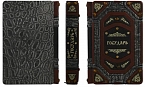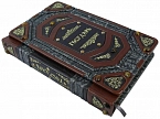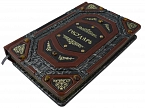 Составной переплет «Брадель», ручной работы, выполнен из комбинации натуральной кожи (кожа «Scarlett Brown», кожа «Argento Dinosauro», кожа «Robbat Cognac» производства итальянской кожевенной фабрики «Claudio»). Обложка книги двухуровневая, оформлена объемными узорами ручного тиснения и рельефным золотым тиснением (использована фольга «Luxor 240»), латунными холитенами (цвет «Gold»), количеством 8 штук. Обложка и корешок книги инкрустированы натуральными камнями «Кошачий глаз» количеством 14 штук. Обрез выполнен в уникальной технологии художественной запечатки золотой основы.
