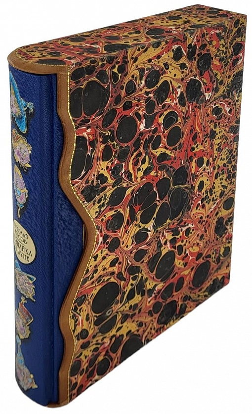 Букинистическое издание в библиофильском переплете. Переплет из натуральной кожи. Художественное тиснение. Ручная роспись по коже. Обрезы окрашены и гравированы с трех сторон. Блок в идеальном состоянии. Индивидуальный фигурный футляр с кожаной окантовкой.