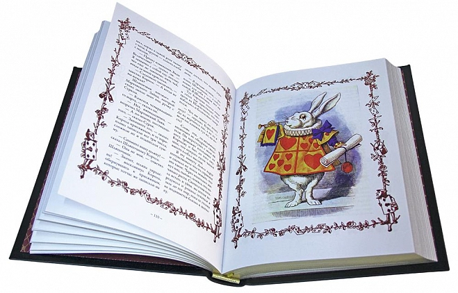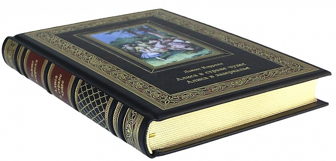 Подарочная книга "Алиса в стране чудес. Алиса в зазеркалье" Льюис Кэрролл АННОТАЦИЯ Текст знаменитой повести Льюис Кэрролла «Алиса в Стране чудес» дан в авторском пересказе Бориса Владимировича Заходера. Издание начинается с предисловия переводчика. Книга великолепно иллюстрирована цветными рисунками и монохромными заставками народного художника РФ Виктора Александровича Чижикова. В конце книги приведены черно-белые варианты его рисунков к этой повести, которые были напечатаны в журнале «Пионер» в 1971–1972 гг. ОПИСАНИЕ Классический европейский переплёт ручной работы из натуральной кожи. Форзац из дизайнерской бумаги Malmero с тиснением орнамента золотой фольгой. 6 бинтов на корешке, ручной обработки. Каптал золотой из натуральной кожи. Обрез блока - золото с торшонированием. Тиснение блинтовое, золотой и цветной фольгой. Ляссе. Инкрустация кожаной вставкой с полноцветной печатью. Вес 730г