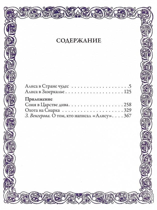 Текст знаменитой повести Льюис Кэрролла «Алиса в Стране чудес» дан в авторском пересказе Бориса Владимировича Заходера. Издание начинается с предисловия переводчика. Книга великолепно иллюстрирована цветными рисунками и монохромными заставками народного художника РФ Виктора Александровича Чижикова. В конце книги приведены черно-белые варианты его рисунков к этой повести, которые были напечатаны в журнале «Пионер» в 1971–1972 гг.