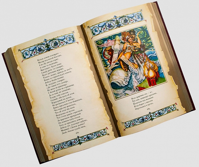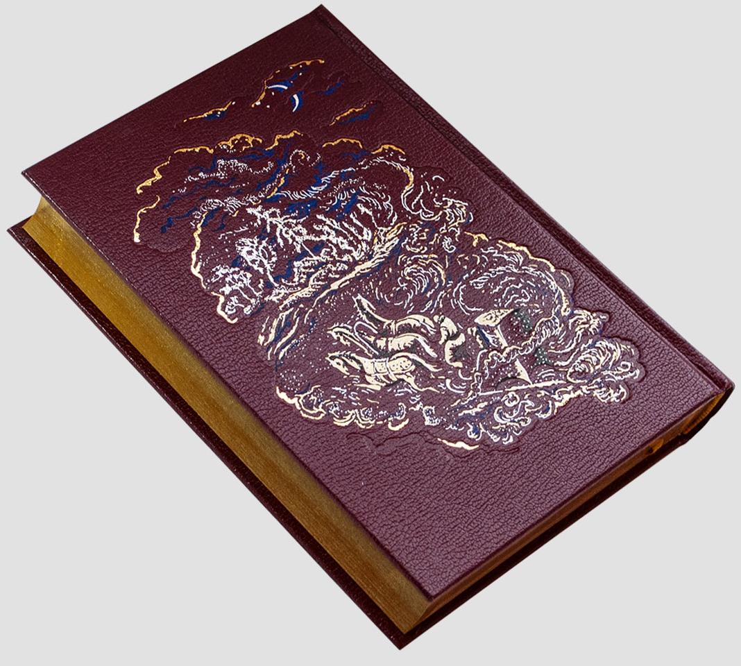 Оригинальные цветные заставки и страницы, стилизованные под свиток старой бумаги в обрамлении золота, создают особую атмосферу издания. Трехсторонний золотой обрез, шелковое ляссе, переплет с оригинальным тиснением 5-ю видами фольги, мелованная бумага, продуманный формат, цветные заставки и страницы, стилизованные под свиток старой бумаги в обрамлении золота, завершают оформление издания, не имеющего равных по уровню полиграфического исполнения. Представленная Вашему вниманию книга станет подлинной жемчужиной любой, даже самой изысканной, библиотеки мира.