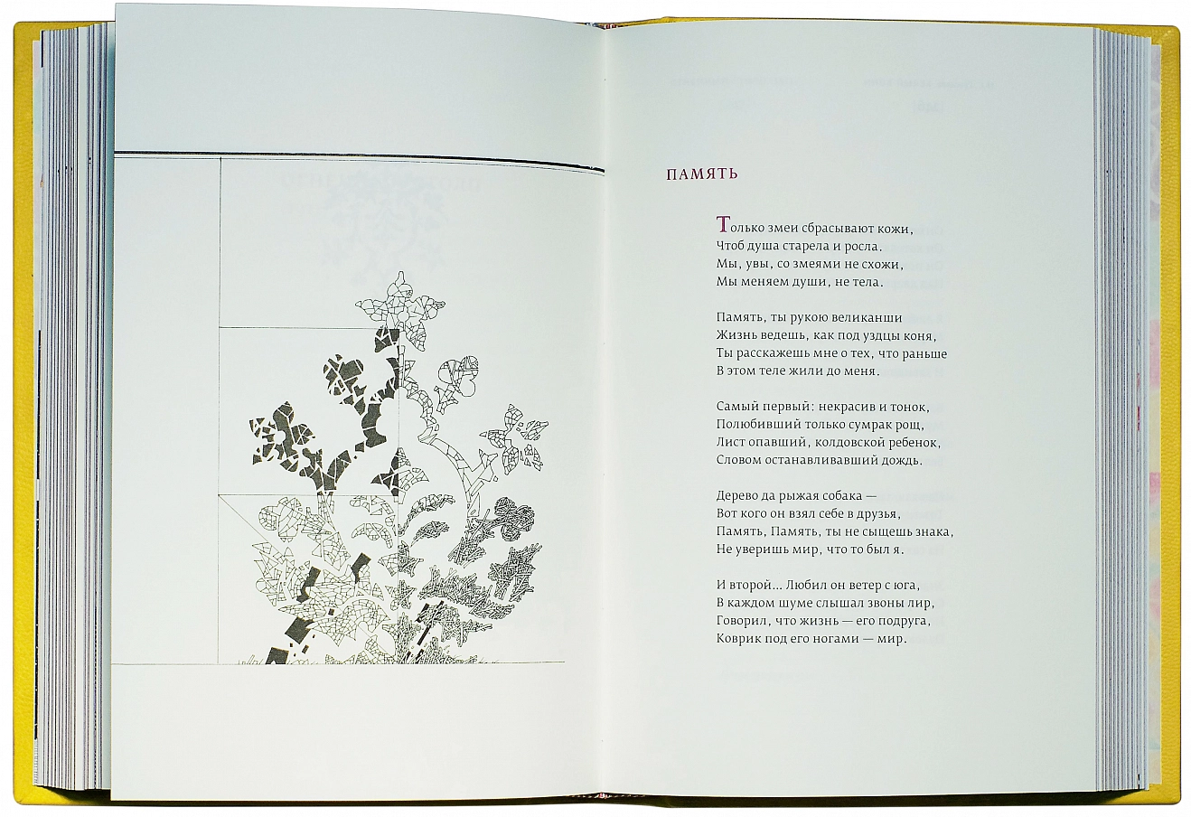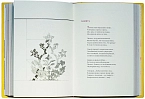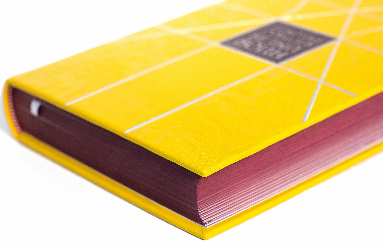 Шелковые каптал и ляссе, бинты на корешке, форзацы из дизайнерской бумаги с авторским рисунком, переплет украшен блинтовым тиснением и тиснением серебряной фольгой, а также вклейками из контрастной кожи