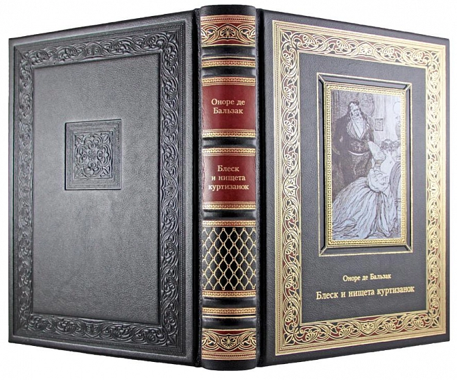Подарочная книга "Блеск и нищета куртизанок" Оноре де Бальзак АННОТАЦИЯ «Блеск и нищета куртизанок» — одна из «Сцен жизни Парижа» большого цикла «Человеческая комедия», написанная О. де Бальзаком в 1838-1847гг. Автор-гуманист рисует картины из жизни современного ему французского общества, привлекая внимание к положению беднейших слоев населения. Иллюстрации к роману создал французский художник XIX в. Шарль Уард. Его работы подчеркивают социальную направленность произведения." ОПИСАНИЕ Классический европейский переплёт ручной работы из натуральной кожи. Форзац из дизайнерской бумаги Malmero с тиснением орнамента золотой фольгой. 6 бинтов на корешке, ручной обработки. Каптал золотой из натуральной кожи. Обрез блока - золото с торшонированием. Тиснение блинтовое, золотой и цветной фольгой. Ляссе. Инкрустация кожаной вставкой с полноцветной печатью. Вес 820г