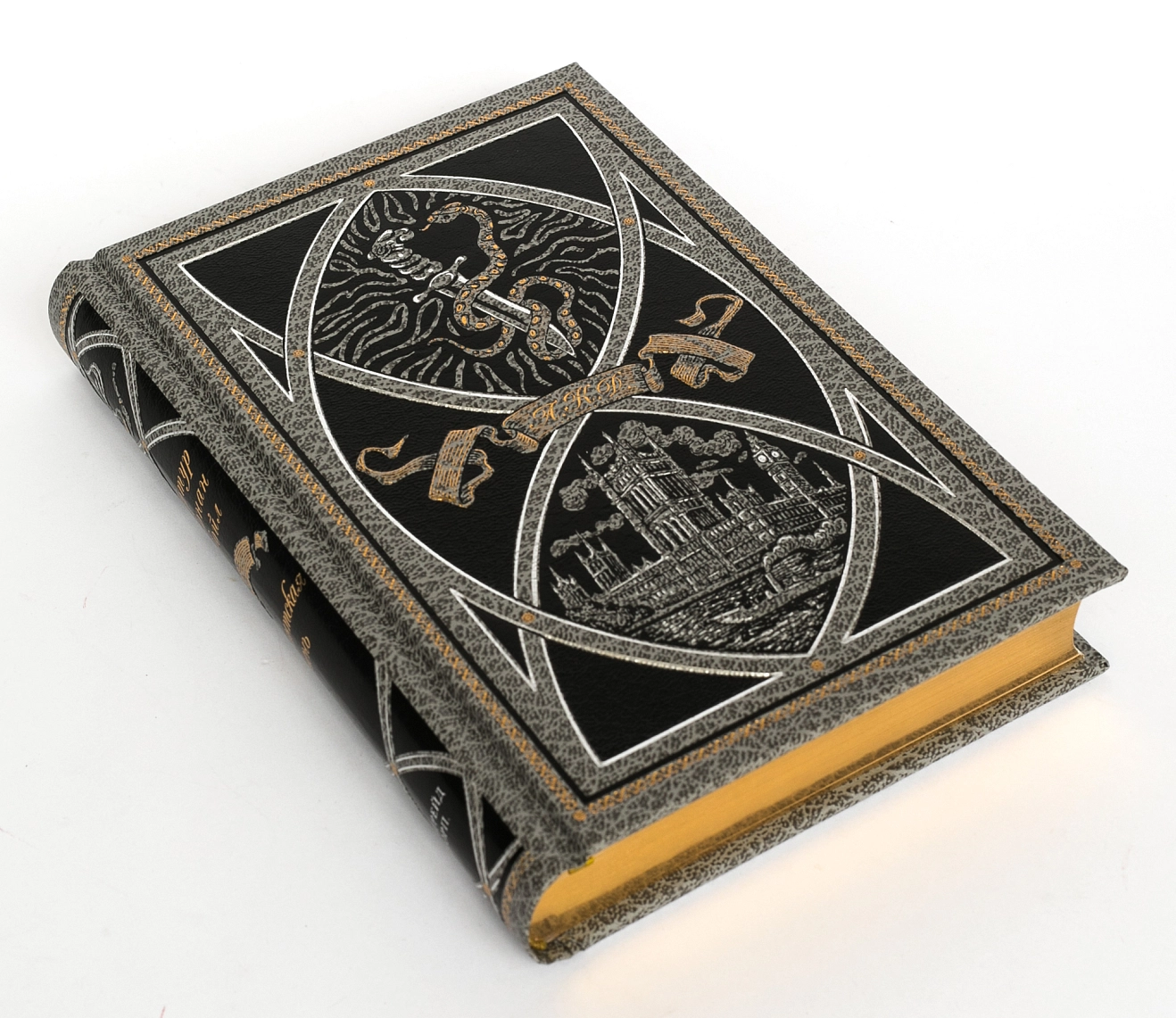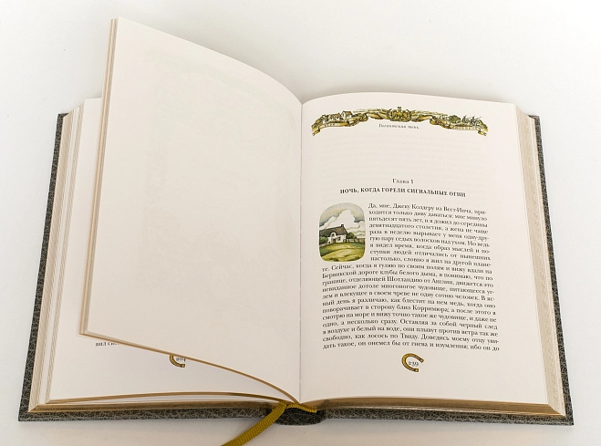 Трехсторонний золотой обрез, переплет с оригинальным тиснением фольгой различных цветов, шелковое ляссе. Со страниц, украшенных колонтитульными заставками и своеобразными рисунками на спусковой полосе, предстанут как живые герои наиболее популярных произведений любимого автора. Увидеть их воочию позволят около пятидесяти цветных иллюстраций художников А. Дудина, Э. Детайля, Г. Пиффарда, большинство из которых были подготовлены для этого издания и публикуются впервые.