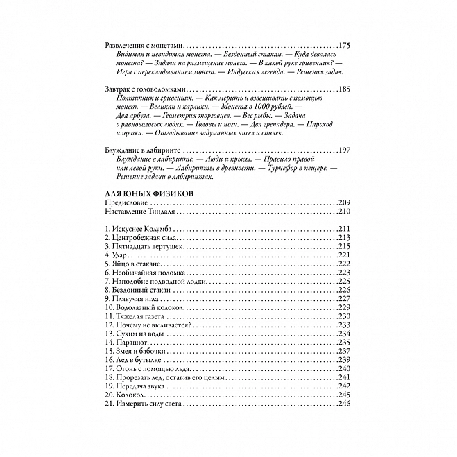 Сборник выдающегося отечественного популяризатора науки и автора многочисленных книг, развивающих мышление, Якова Исидоровича Перельмана (1882–1942) включает описания нескольких сотен различных фокусов, задач и головоломок, в том числе увлекательные развлечения с бумагой, монетами и другими обычными предметами. В книгу включены загадки для юных физиков, истории про числа-великаны, опыты с применением электростатики, описания оптических иллюзий, а также рассказ о методике развития памяти.