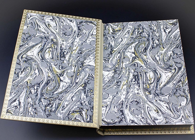 Исторический, французский стиль переплета, индивидуальный дизайн тиснения на коже. Отпечатана на дизайнерской бумаге «Ozon Ivory», блок страниц тонирован с нанесением золотого орнамента. полностью ручная работа.