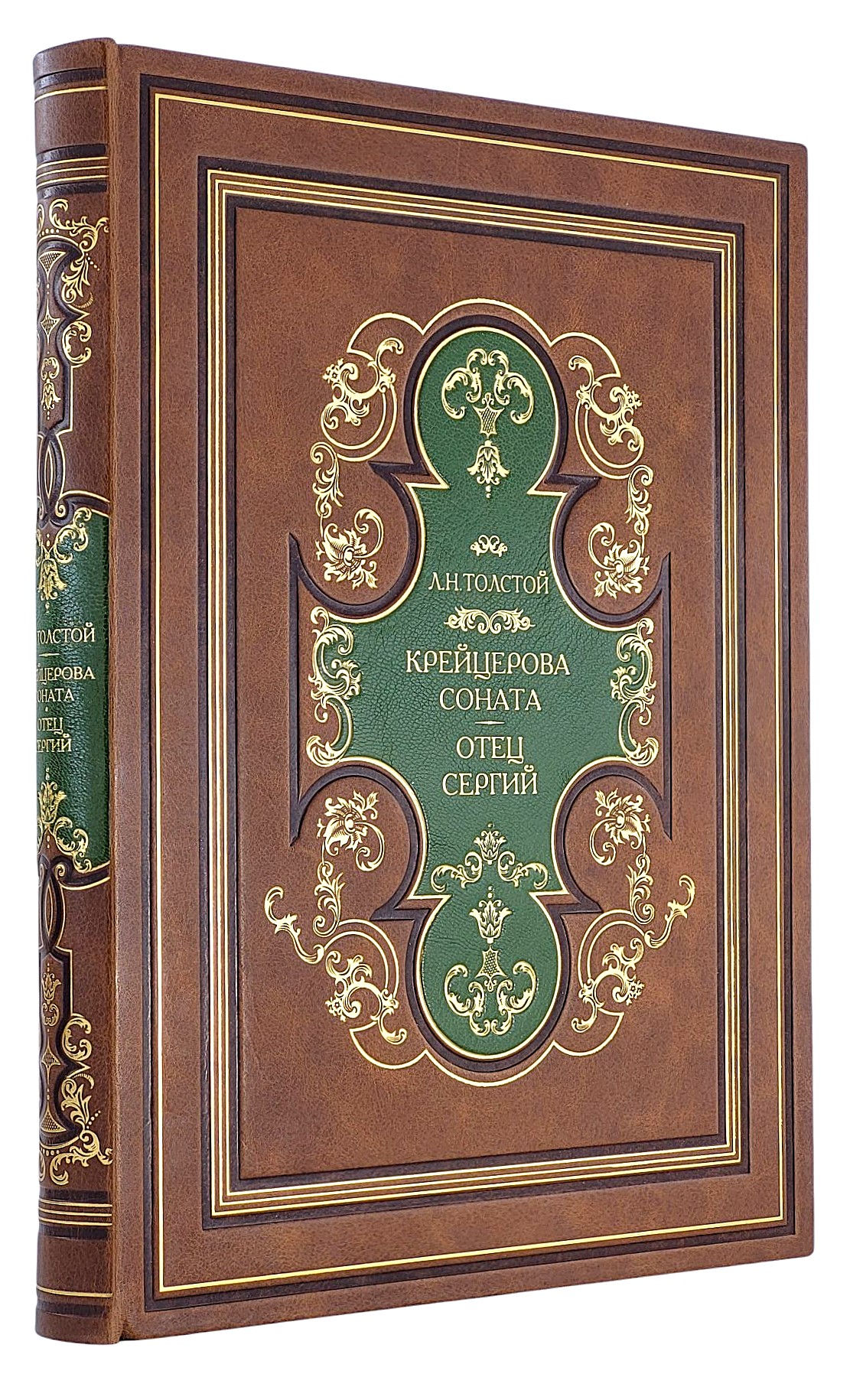 Подарочная книга "Крейцерова соната /Отец Сергий" Толстой Л.Н. АННОТАЦИЯ Коллекционная. Тираж 50 номерных экземпляров. Новая книга в серии «Библиотека иллюстрированной классики» – «Крейцерова соната», «Отец Сергий» с иллюстрациями Ю. Иванова. ОПИСАНИЕ Особенности оформления и переплета: Книга исполнена по старинной французской технологии; Переплёт ручной, цельнокожаный; Художественное двухцветное тиснение на обложке и корешке; вставки из шагреневой кожи другого цвета. Бумага дизайнерская, кремовая (Франция); Блок сшит на пяти шнурах; Форзац выполнен из мраморной бумаги ручного крашения; Дублюра окатана вручную 23-каратным золотом; Обрез блока с художественным оформлением: окрашен и гравирован вручную; Ляссе шелковое, каптал ручного плетения; Индивидуальный футляр.