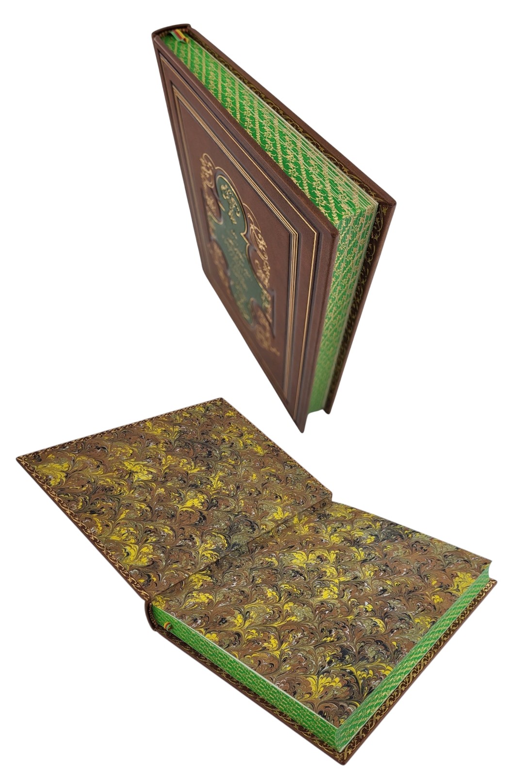Особенности оформления и переплета: Книга исполнена по старинной французской технологии; Переплёт ручной, цельнокожаный; Художественное двухцветное тиснение на обложке и корешке; вставки из шагреневой кожи другого цвета. Бумага дизайнерская, кремовая (Франция); Блок сшит на пяти шнурах; Форзац выполнен из мраморной бумаги ручного крашения; Дублюра окатана вручную 23-каратным золотом; Обрез блока с художественным оформлением: окрашен и гравирован вручную; Ляссе шелковое, каптал ручного плетения; Индивидуальный футляр.