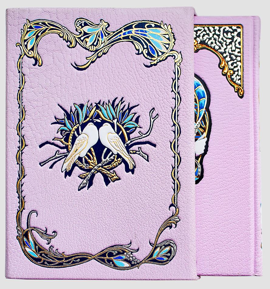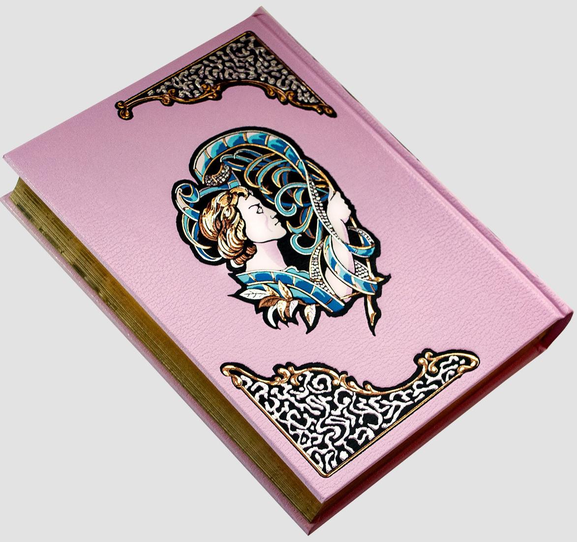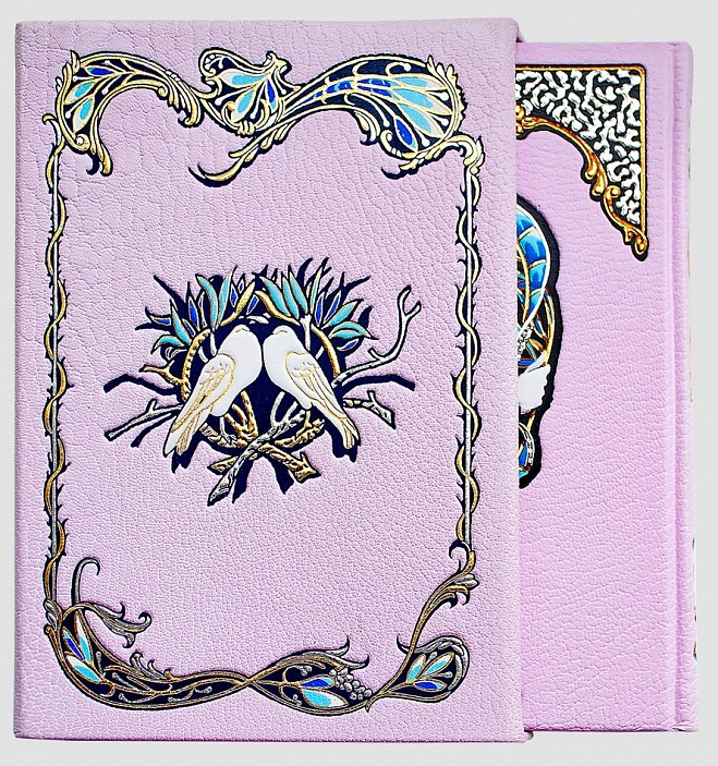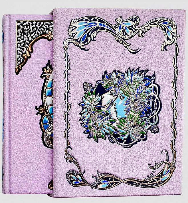 Напечатано в Словении лимитированным тиражом на элитной бумаге G-print. Книги переплетены в кожу Maroken (Франция) и помещены в уникальный по сложности выполнения кожаный футляр ручной работы с тиснением фольгой на всех сторонках футляра. Необычный переплет с тиснением 9-ю различными цветами фольги,оригинальные заставки, изящные уголки и рамки и трехсторонний золотой обрез создают потрясающе изысканное обрамление издания, способного заинтересовать самого придирчивого ценителя прекрасного.