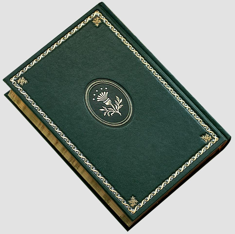 Уникальный кожаный футляр ручной работы с тиснением фольгой на всех сторонках футляра. Трехсторонний золотой обрез, классический переплет с тиснением золотой и серебряной фольгой украшает рисунок в виде медальона с монограммой автора, шелковое ляссе дополняет оформление.
